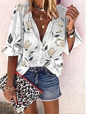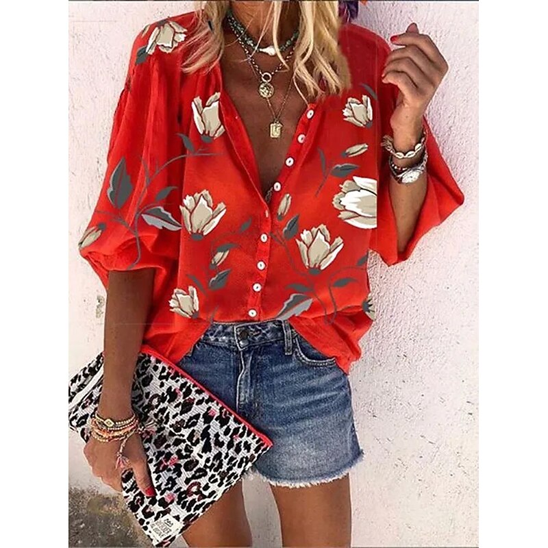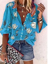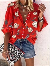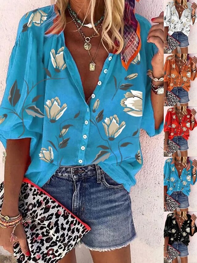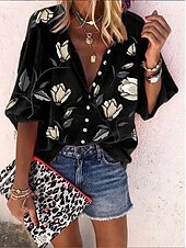 More information about Women's Blouse Floral Graphic Bohemia Daily Casual Sleeveless 3/4 Length Sleeve High Neck Regular Tops Buttons Print Black White Red Blue Orange Summer Spring