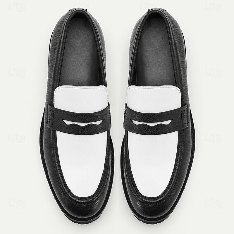 HOT ! Men's Black and White Loafers – Genuine Leather Slip-On Shoes with Contrast Panel, Comfortable Business Casual Footwear for Office, Travel and Daily Wear