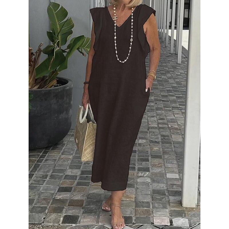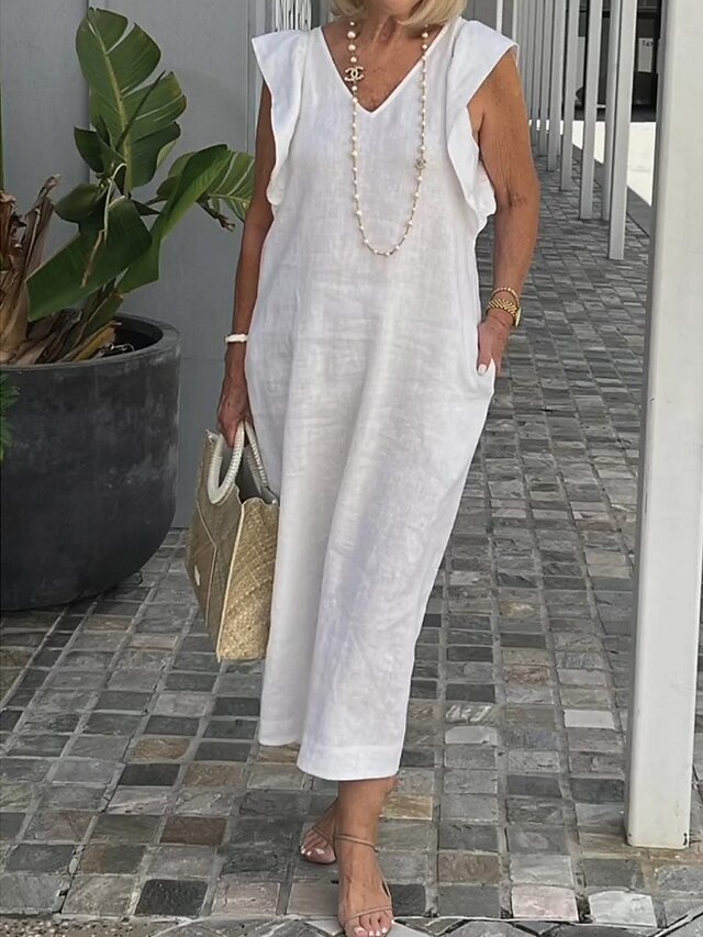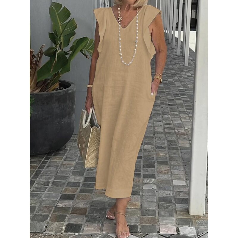 Highlights [Fabric] : Crafted from high-quality linen, this women's dress offers lightweight and breathable comfort, perfect for warm weather during the spring and summer seasons. The inelastic nature of the fabric ensures a structured yet comfortable fit. [Silhouette] : Designed with a loose fit, this dress provides both comfort and style. The flowing silhouette enhances mobility and is flattering for various body types, making it an ideal choice for both casual and semi-formal settings. [Design Highlights] : Featuring a sleeveless design with elegant ruffle details on the shoulders, this dress showcases a deep V-neckline that adds sophistication and femininity. The inclusion of practical pockets brings functionality without sacrificing style. [Occasions] : Perfectly suited for daily activities, weekend getaways, and relaxed gatherings, this versatile sundress complements various occasions with its chic and effortless appeal. [Size Range] : Available in an extensive range of sizes from S to 3XL, this dress accommodates a wide array of preferences, ensuring a comfortable fit for everyone. The plain pattern and timeless design make it a staple piece in any wardrobe.