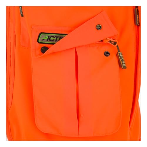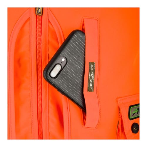 • VERSATILE HUNTING VEST FOR MEN - This blaze orange vest features a vertical Magnattach chest pocket, which uses magnetic closure technology for quick and easy access to essential items without the noise of traditional zippers or Velcro; a center chest zippered pocket provides secure storage for items that need extra protection; the front-load game bag is designed for convenience, allowing hunters to store game quickly and efficiently