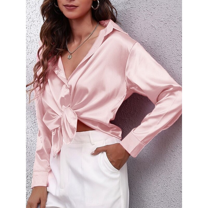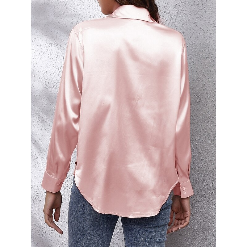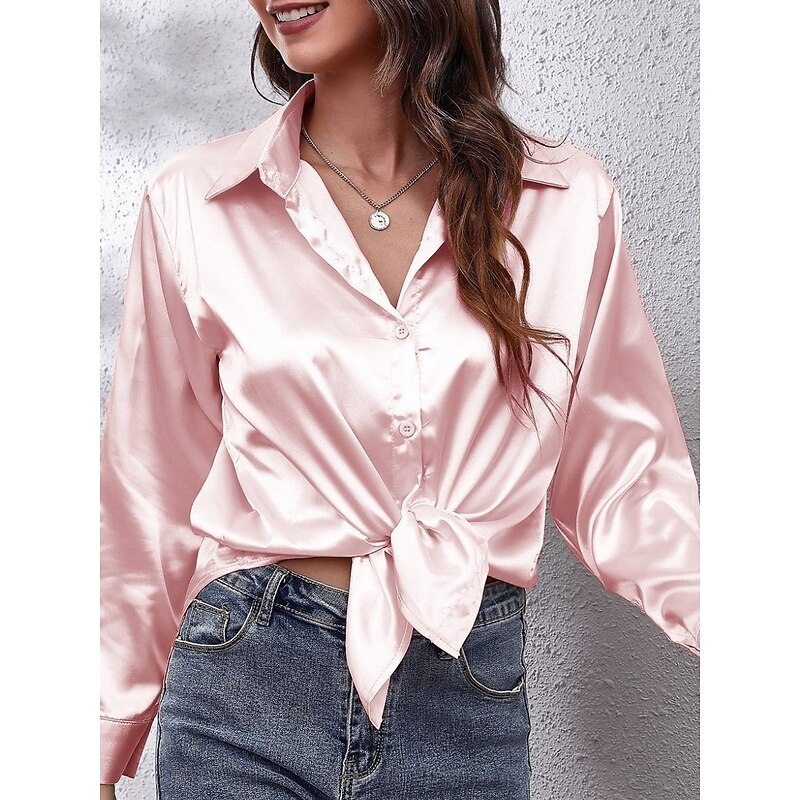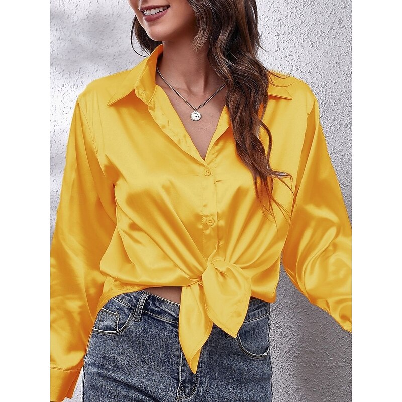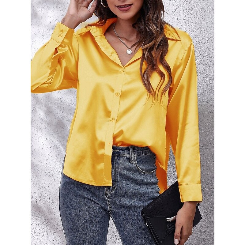 HOT ! Women's Shirt Elegant Dressy Satin Solid Color Business Modern Casual Long Sleeve Shirt Collar Regular Tops Work Formal Wear Buttons Yellow Pink Wine Blue Green Summer Spring