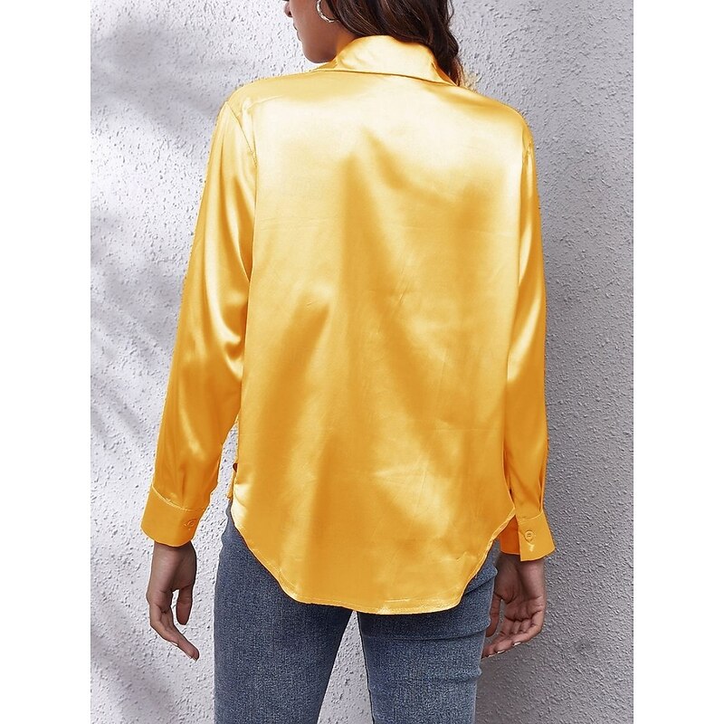 Women's Shirt Elegant Dressy Satin Solid Color Business Modern Casual Long Sleeve Shirt Collar Regular Tops Work Formal Wear Buttons Yellow Pink Wine Blue Green Summer Spring 22