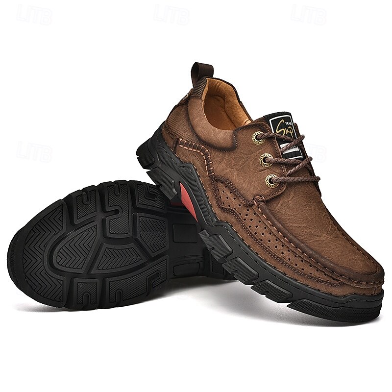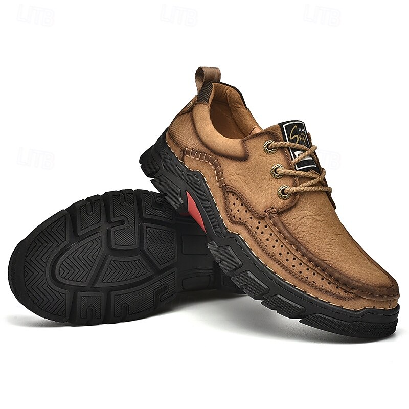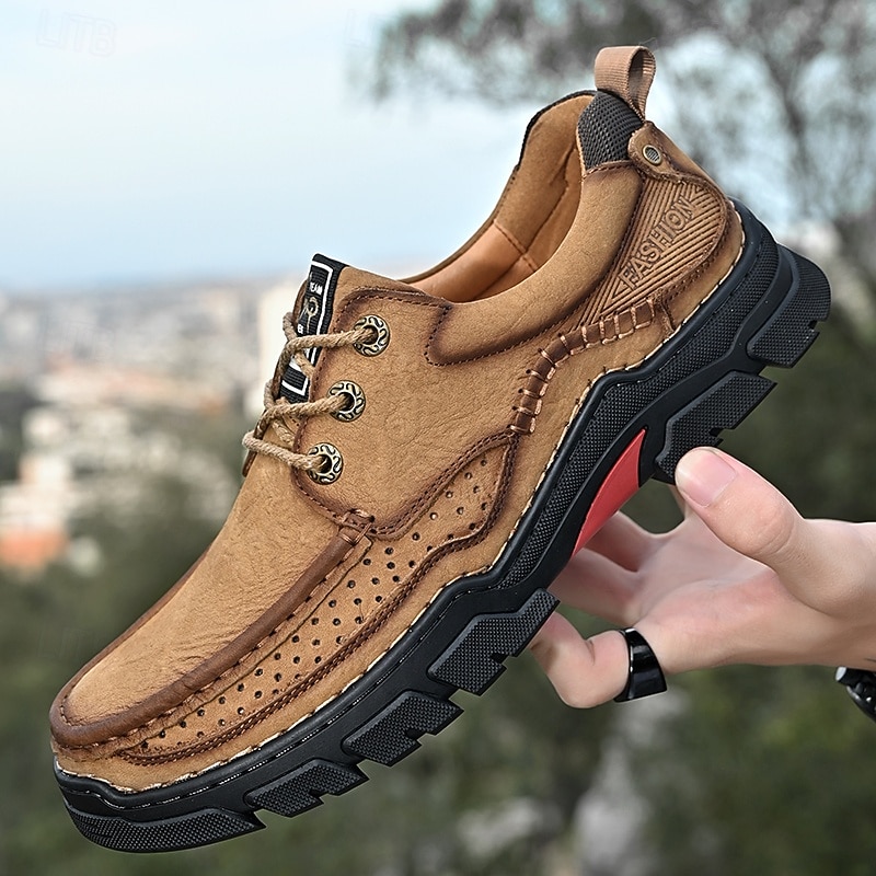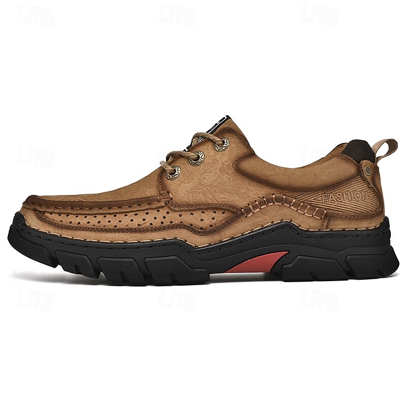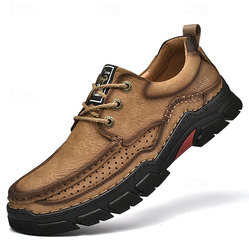 Highlights [Fabric] : Expertly crafted with high-quality microfiber for the upper and PU for the lining, these men's outdoor shoes ensure both breathability and durability. The combination of materials guarantees all-day comfort and robust performance, making them suitable for a variety of conditions. [Fit] : These shoes feature a classic oxford design with a round toe shape. The lace-up closure with metal eyelets ensures a secure fit, while the cushioned interior provides added comfort for extended wear. [Design Highlights] : Highlighting intricate stitching details and decorative perforations on the rich tan upper, these shoes add a touch of sophistication to the rugged design. The black and red rugged tread pattern on the durable rubber outsole offers excellent grip and stability on different surfaces. The convenient pull tab at the back makes them easy to put on and take off, combining practicality with style. [Occasions] : Perfect for hiking, casual outings, and various outdoor activities, these shoes are versatile enough for both adventure and leisure. They complement a wide range of outfits, making them suitable for different settings from trails to city streets. [Sizes] : Available in a range of sizes from US6-6.5/EU38 to US11/EU44, these shoes cater to a broad spectrum of feet sizes, ensuring an optimal fit for most wearers.