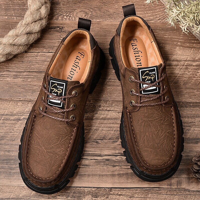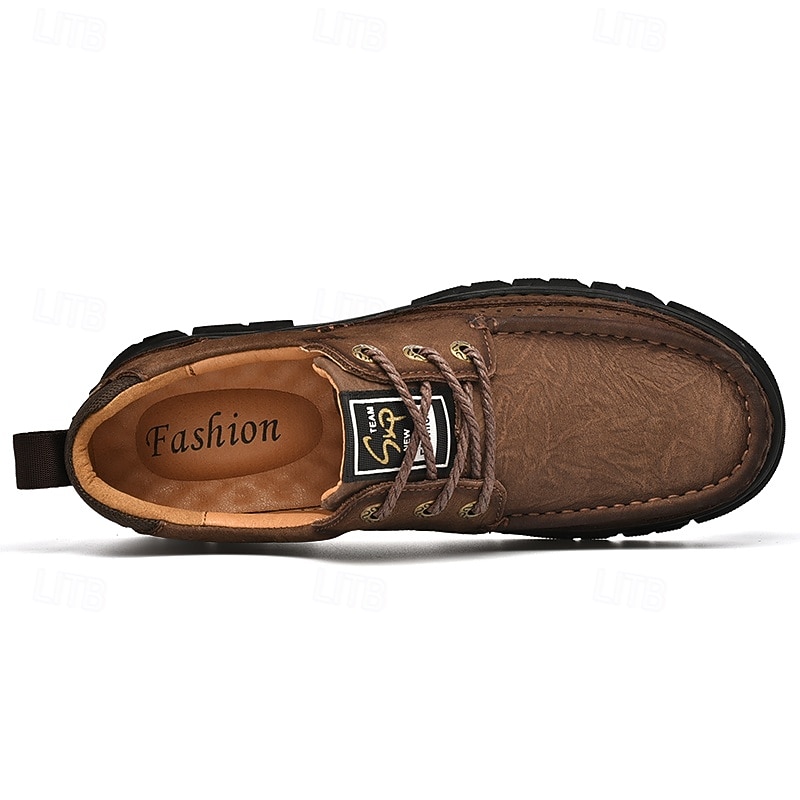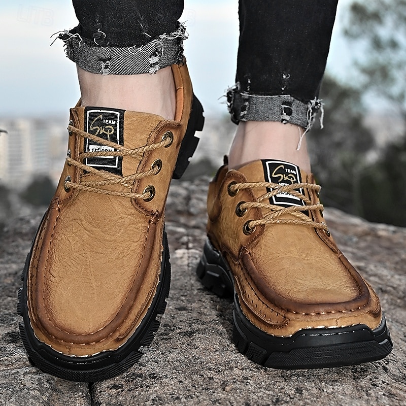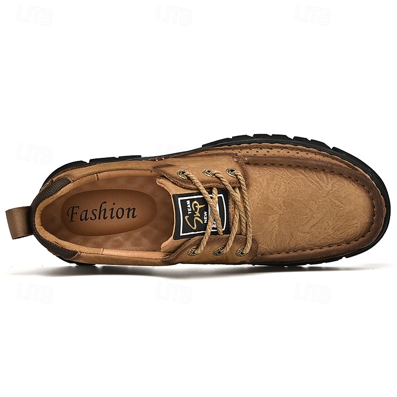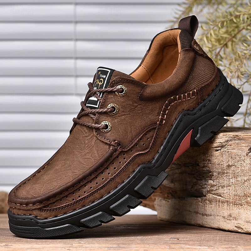 Highlights [Fabric] : Expertly crafted with high-quality microfiber for the upper and PU for the lining, these men's outdoor shoes ensure both breathability and durability. The combination of materials guarantees all-day comfort and robust performance, making them suitable for a variety of conditions. [Fit] : These shoes feature a classic oxford design with a round toe shape. The lace-up closure with metal eyelets ensures a secure fit, while the cushioned interior provides added comfort for extended wear. [Design Highlights] : Highlighting intricate stitching details and decorative perforations on the rich tan upper, these shoes add a touch of sophistication to the rugged design. The black and red rugged tread pattern on the durable rubber outsole offers excellent grip and stability on different surfaces. The convenient pull tab at the back makes them easy to put on and take off, combining practicality with style. [Occasions] : Perfect for hiking, casual outings, and various outdoor activities, these shoes are versatile enough for both adventure and leisure. They complement a wide range of outfits, making them suitable for different settings from trails to city streets. [Sizes] : Available in a range of sizes from US6-6.5/EU38 to US11/EU44, these shoes cater to a broad spectrum of feet sizes, ensuring an optimal fit for most wearers.