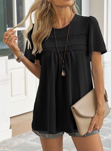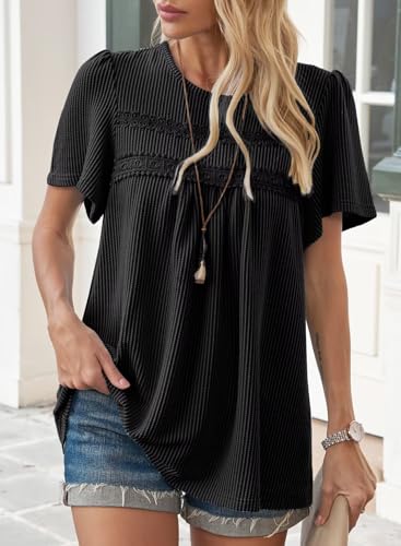 More information about Womens Summer Tops Crewneck Short Sleeve Striped Shirts Casual Ribbed Blouses Flowy Hem Boho Clothing 2025