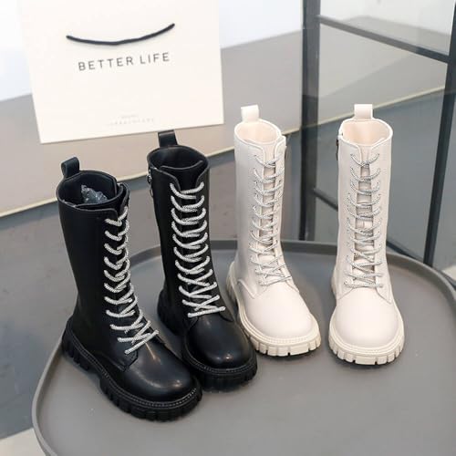 Girls Leather Lace Up Knee High Boots with Side Zipper Fashion Round Toe Low Heel Mid Calf Combat Riding Boots Winter Tall Boots Dress Princess Shoes 4