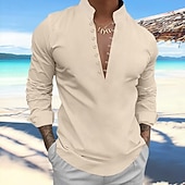 Men's Shirt Linen Shirt Popover Shirt Summer Shirt Beach Wear Plain Vacation Curise Black White Blue Sky Blue Long Sleeve Stand Collar Spring & Summer Clothing Apparel 21