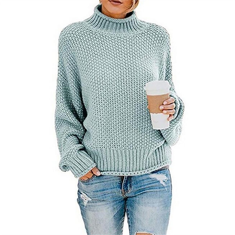 Women's Pullover Sweater Jumper Basic Casual Solid Color Chunky Crochet Turtleneck Knitted Long Sleeve Knit Daily Going out Light Blue Black Fall Winter 22