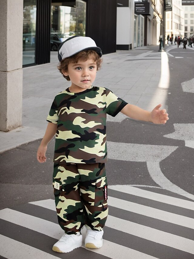 HOT ! 2 Pieces Toddler Boys T-shirt & Shorts Outfit Camo Short Sleeve Crewneck Set School Fashion Daily Summer 4-7 Years Army Green