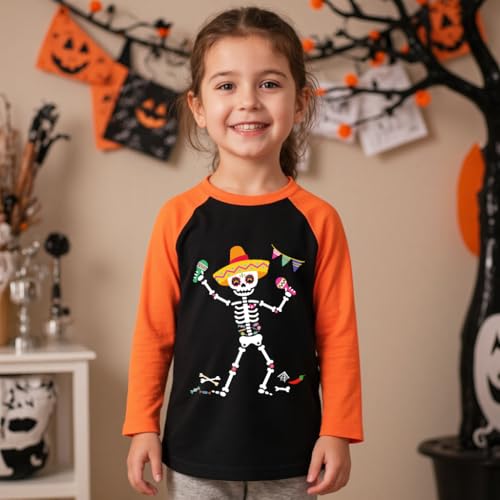 • 💀 These Kids Halloween Shirt for Boys and Girls are Lightweight, Classic fit. Crew-neck is easy for toddlers to wear or put off, feeling comfortable when wearing. Coordinated color matching orange&black/orange&white halloween raglan long sleeve shirt / Tee Shirt with Half Straped Sleeve for baby/toddler/kids. And Glow in the Dark Printting. For best glow effect, expose to light for a time before wearing.