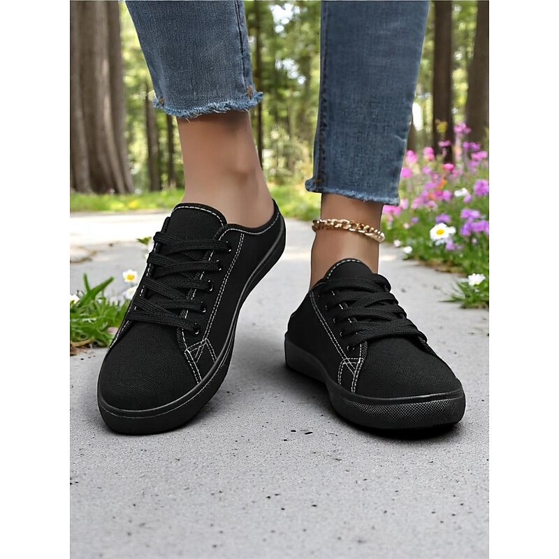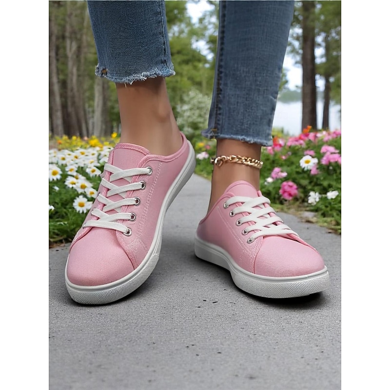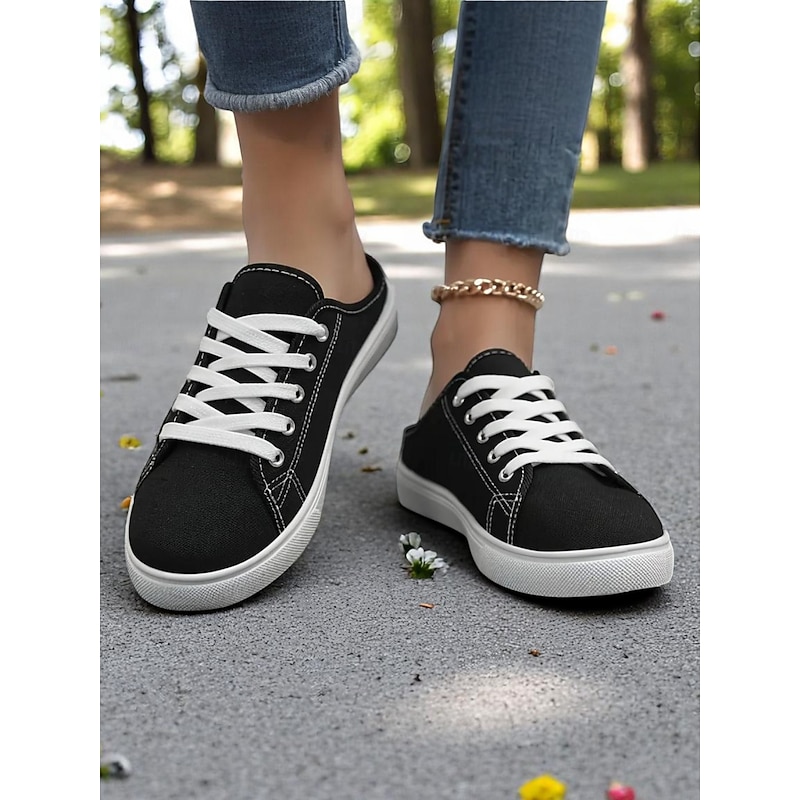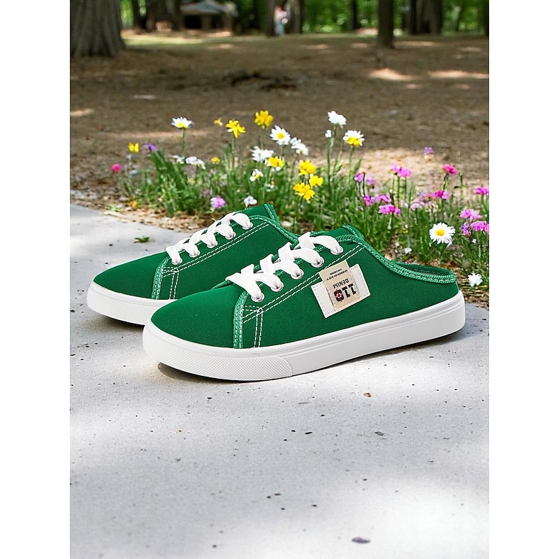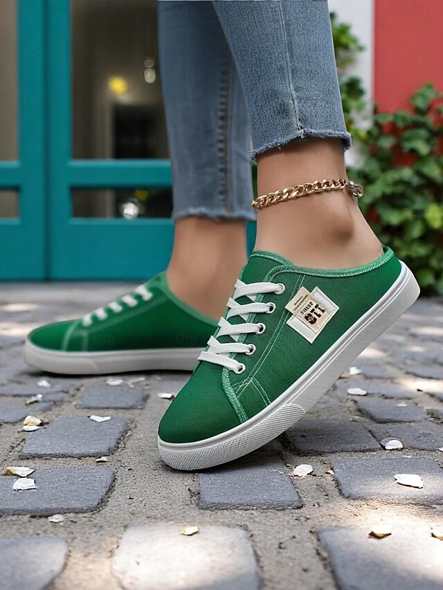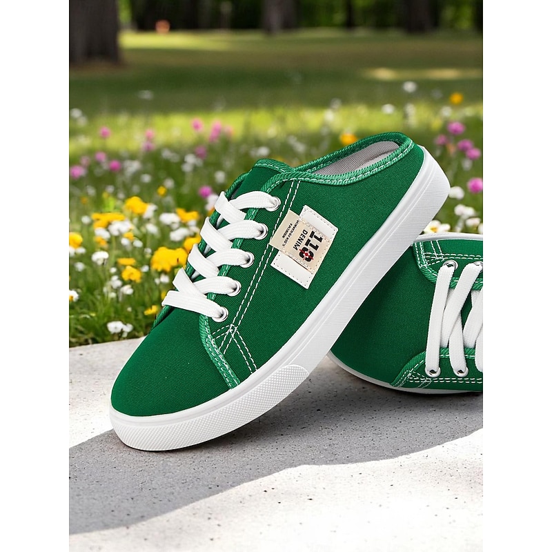 HOT ! Women's Green Canvas Slip-On Sneakers with Lace-Up Design – Comfortable Backless Trainers, Ideal for Walking, Shopping, School Runs & Casual Summer Days