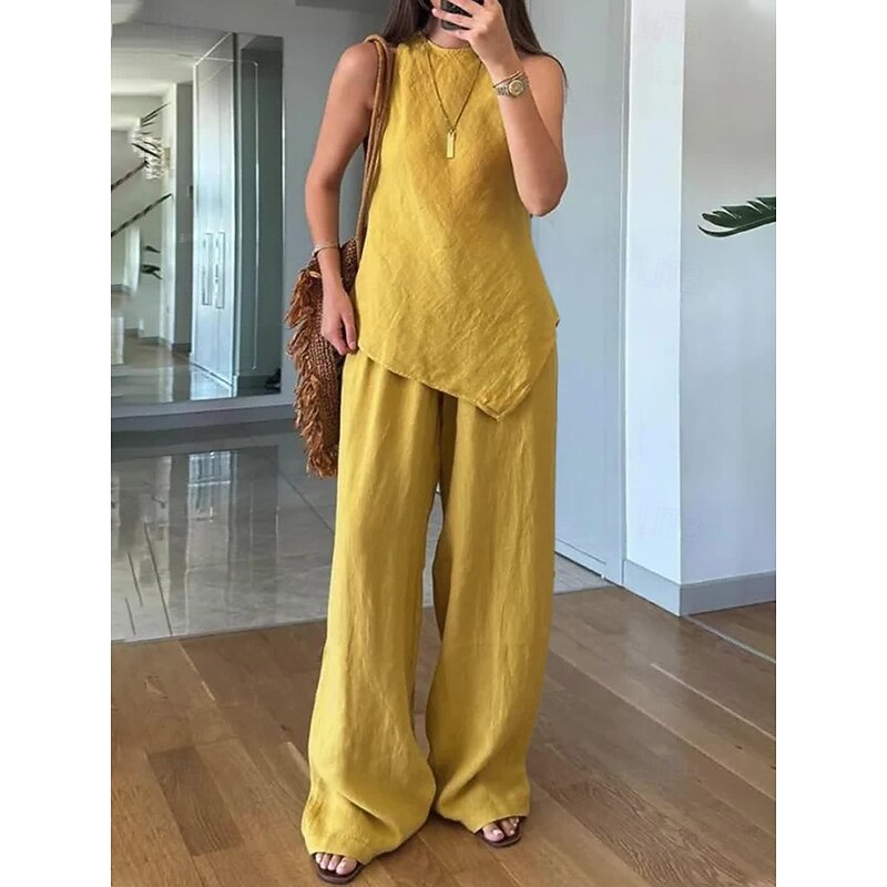 Women Distressed Linen-Inspired Sets Two Piece Sets Bolero Top Sleeveless Crew Neck Solid Color Black White Yellow Summer Loose Fit 12