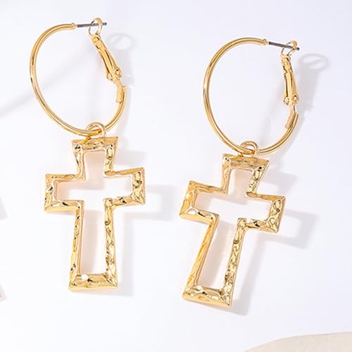 Chunky Gold Cross Earrings for Women Boho Hammered Earrings Bold Thick Big Cross Drop Dangle Earrings for Women Vintage Statement Jewelry 5