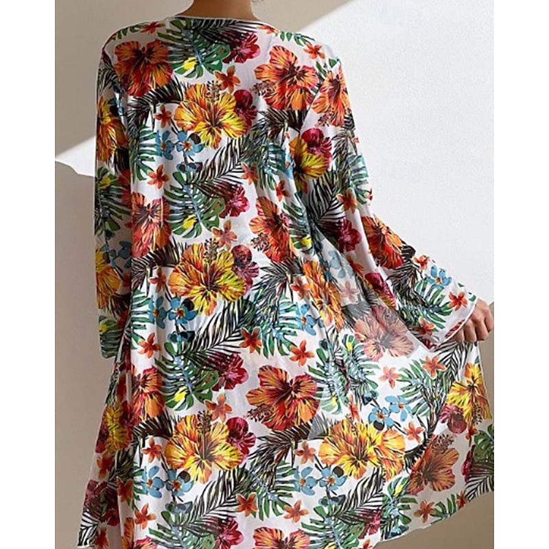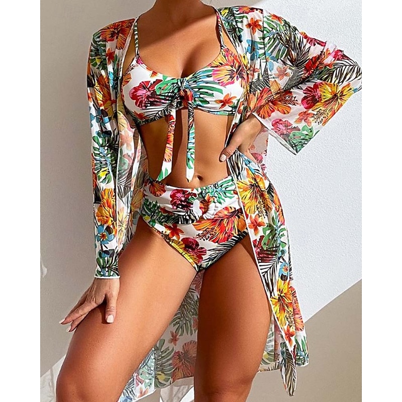 Highlights [Fabric] : Crafted from stretchy nylon, this women's swimwear set offers a comfortable and flexible fit. The breathable material ensures you stay cool and comfortable, whether you're lounging by the pool or taking a dip in the ocean. [Silhouette] : Featuring a flattering three-piece design, this swimwear set includes a bikini top with adjustable spaghetti straps and a front tie, coupled with high-waisted bikini bottoms for a sleek and confident silhouette. [Design Highlights] : The standout piece in this set is the long, sheer cover-up with long sleeves and a flowing design. Adorned with a vibrant floral tropical print in colors such as red, yellow, green, and orange, it brings a bold touch to your beach look. The mixture of vivid colors and the chic tropical pattern make this set a head-turner. [Occasions] : Perfect for spring and summer vacations, this swimwear set is ideal for beach outings, poolside lounging, and tropical getaways. Its versatile design allows you to effortlessly transition from a swim to a casual day at a beach resort. [Size Range] : Available in sizes S, M, L, XL, and 2XL, ensuring a fit that caters to a range of body types.