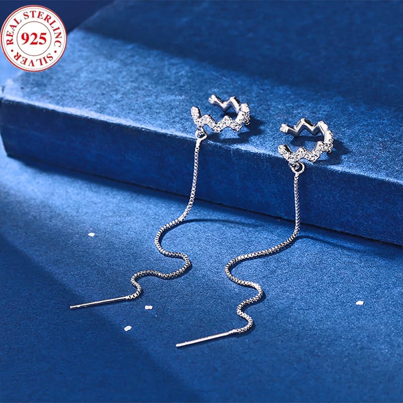 925 Sterling Silver Wave Cuff Earrings with Sparkly Cubic Zirconia Wrap Tassel Earrings for Women Dangle Earrings Threader Chain 6