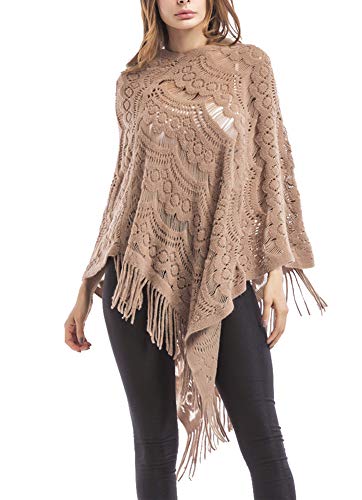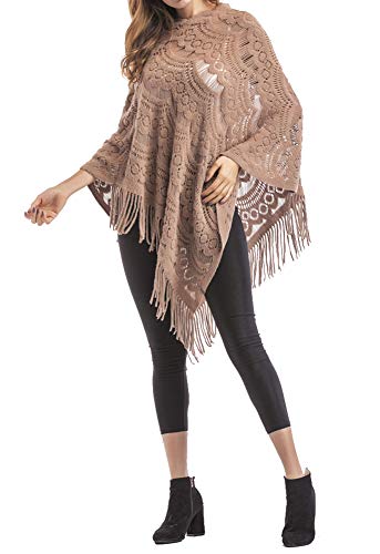 • Well- Designed: The V-neck shawl comes up high on your neck and the poncho is long enough to cover your arms all the way down to your upper thighs. The turtleneck collar can be folded. The lace knitted poncho wrap shawl is a great coverup to keep warm at the season cools and for a cute look. Tassels poncho cape is very versatile, allowing you to wear the piece with a triangle fringed hem or turn for a straight hem. Perfect as a layered top for cool day out or even in the office to keep you warm.