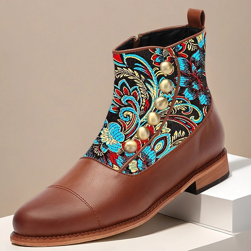 HOT ! Men's Brown and Blue Jacquard Fabric Ankle Boots with Embroidered Pattern, Retro Fashion Statement Boots for Party, Stage Performance and Special Events