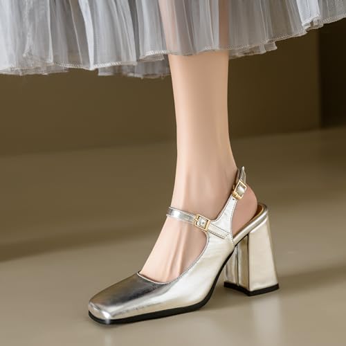 Womens Slingback Mary Jane Pumps High Heels Closed Toe Chunky Heel Ankle Strap Patent Leather Block Heel Square Toe Dress Shoes 6