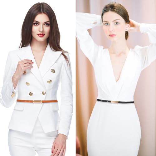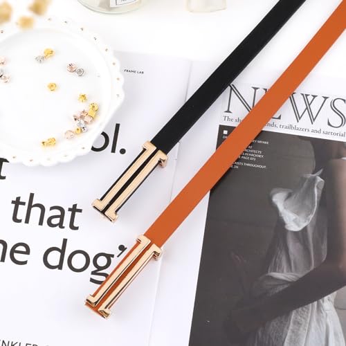 2Pcs Women's PU Leather Skinny Belt, Thin Waist Belt Soft Slim Waistband Alloy Gold Buckle Belt for Dress Pants Jeans 2