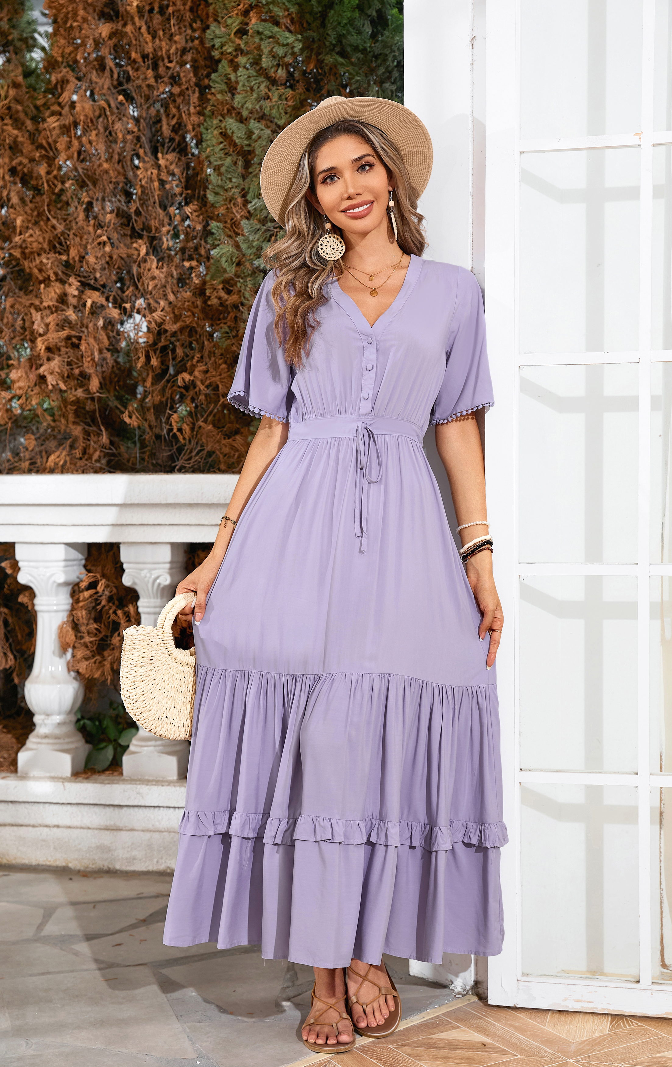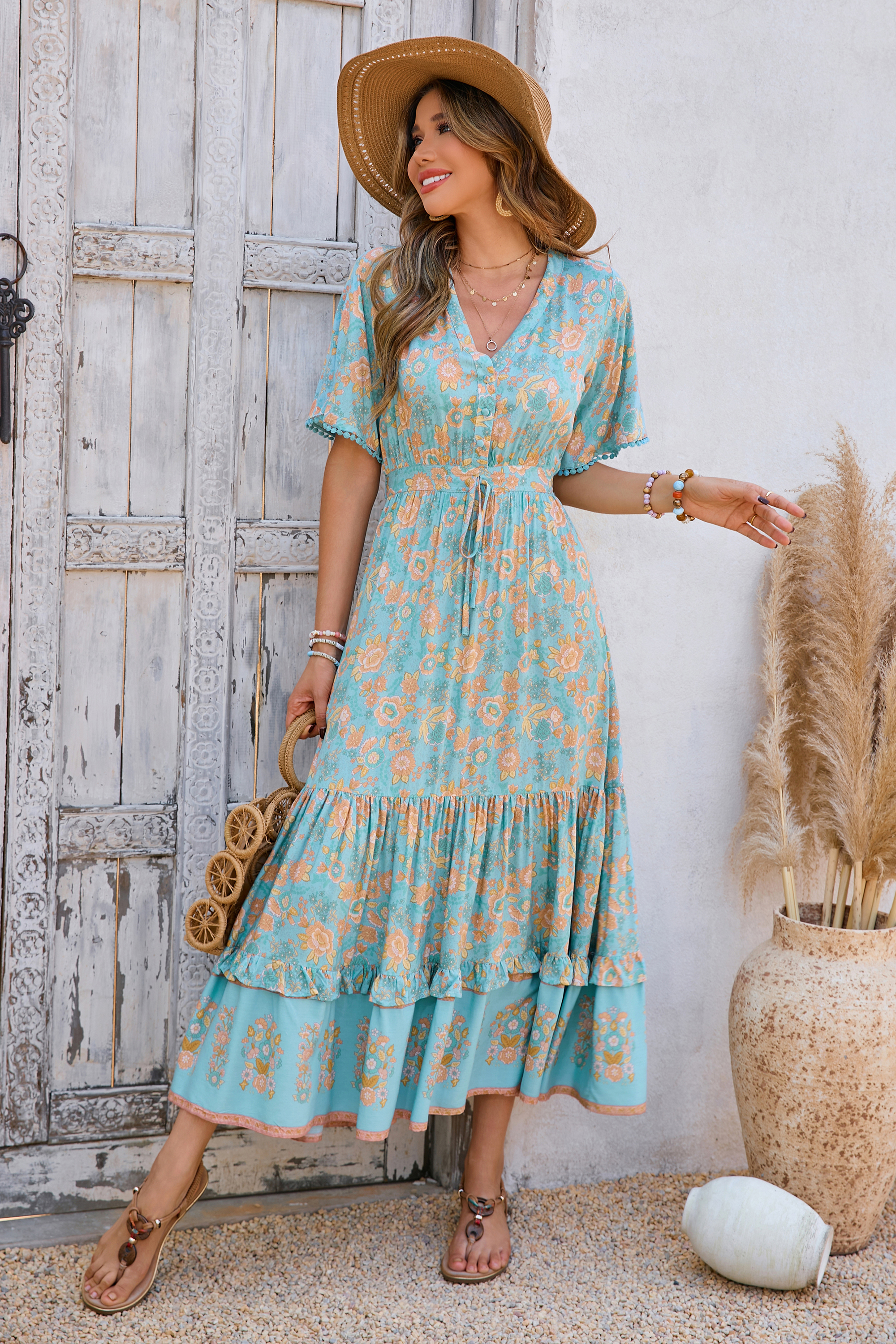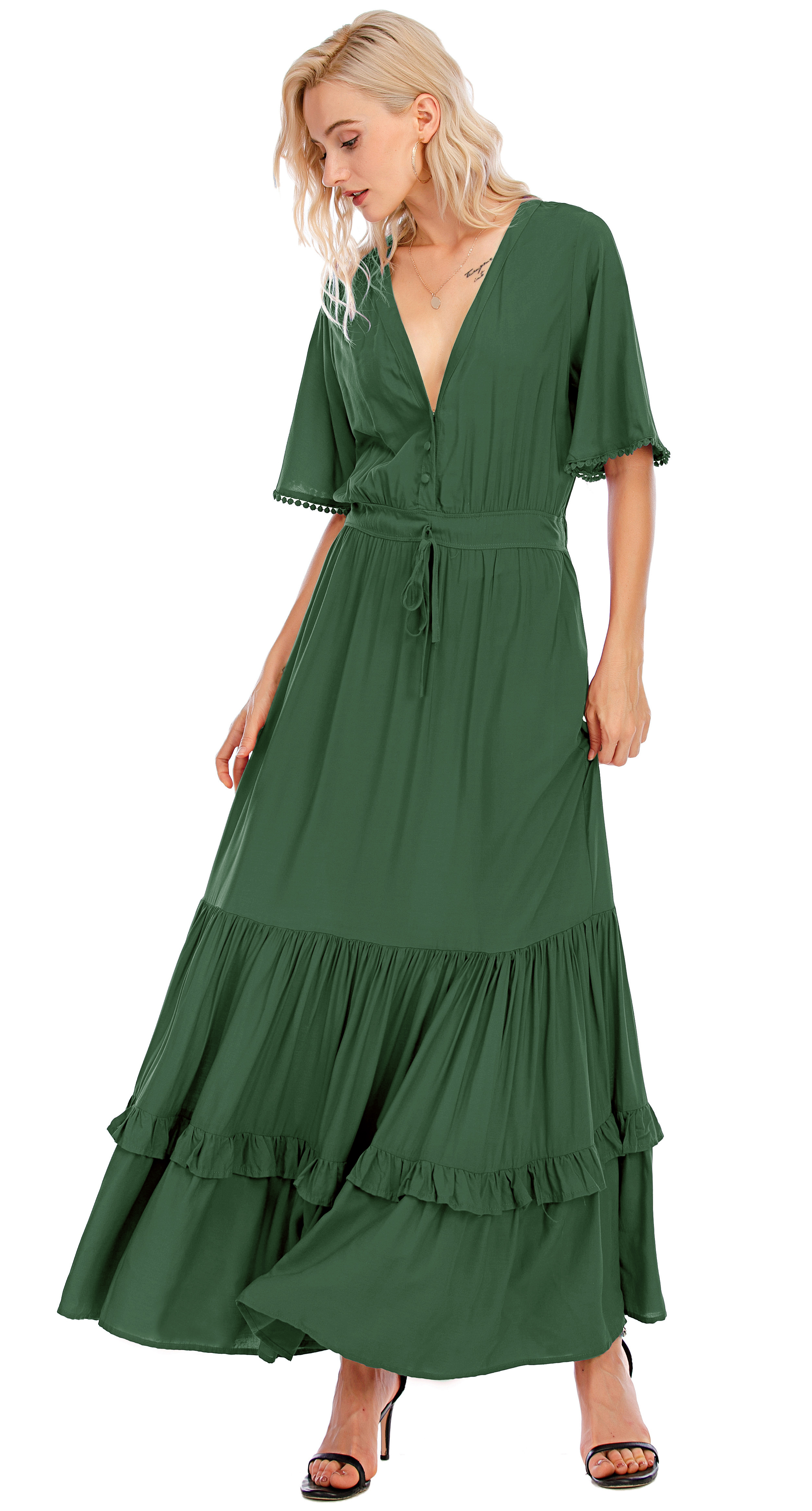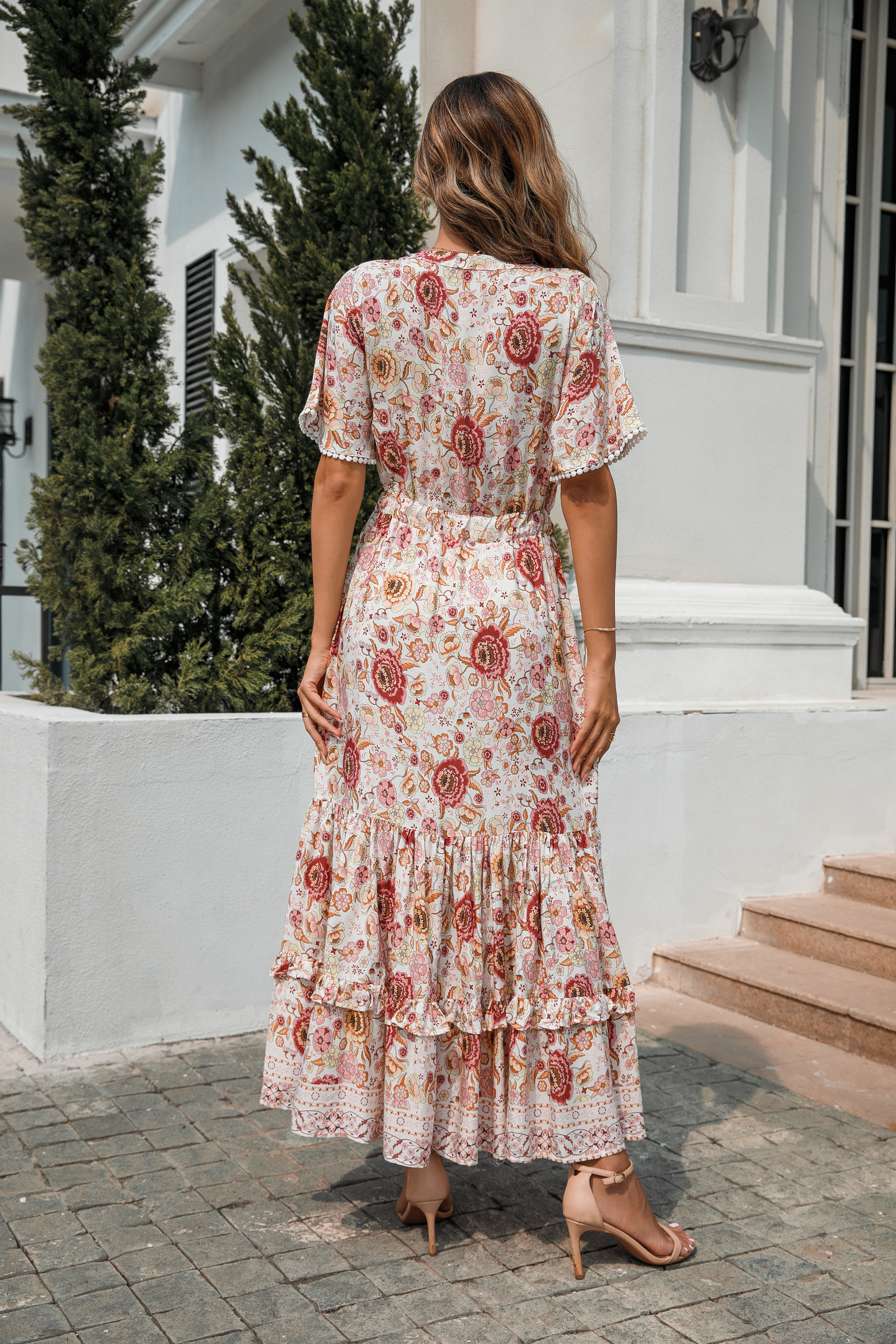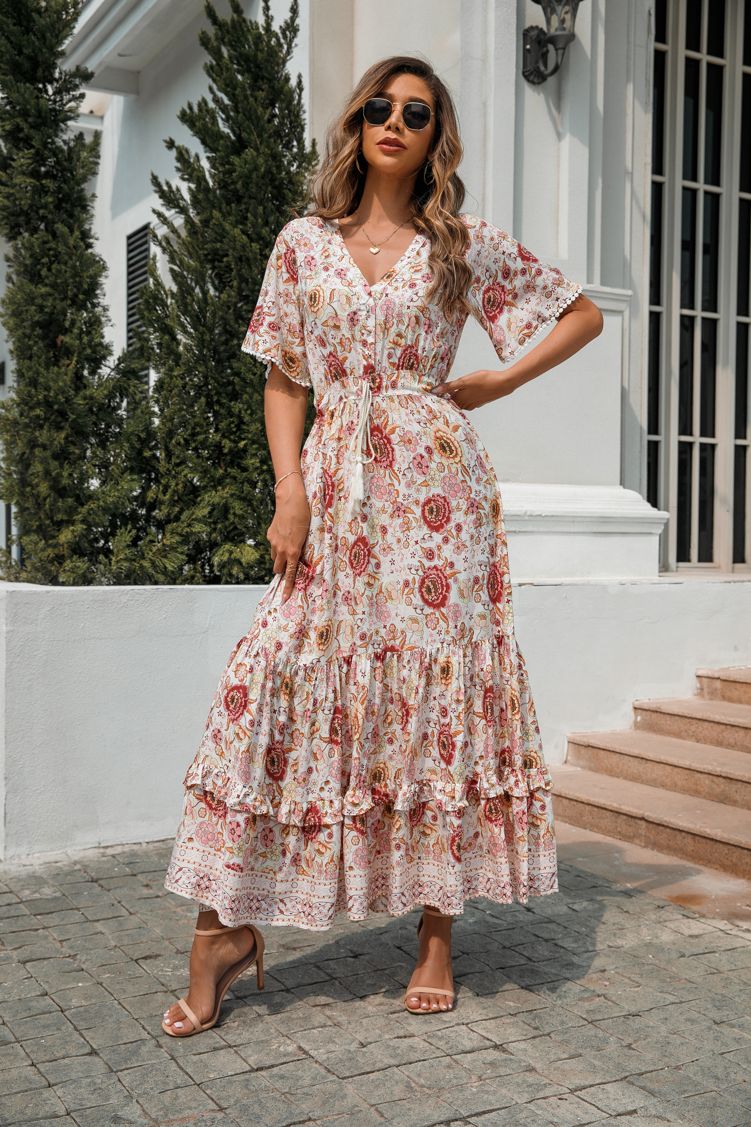This tiered ruffle dress drapes beautifully, creating a flowy and relaxed fit that is both comfortable and casual. Versatile yet dressy style will make this a-line dress become an awesome addition if you are building your summer wardrobe!