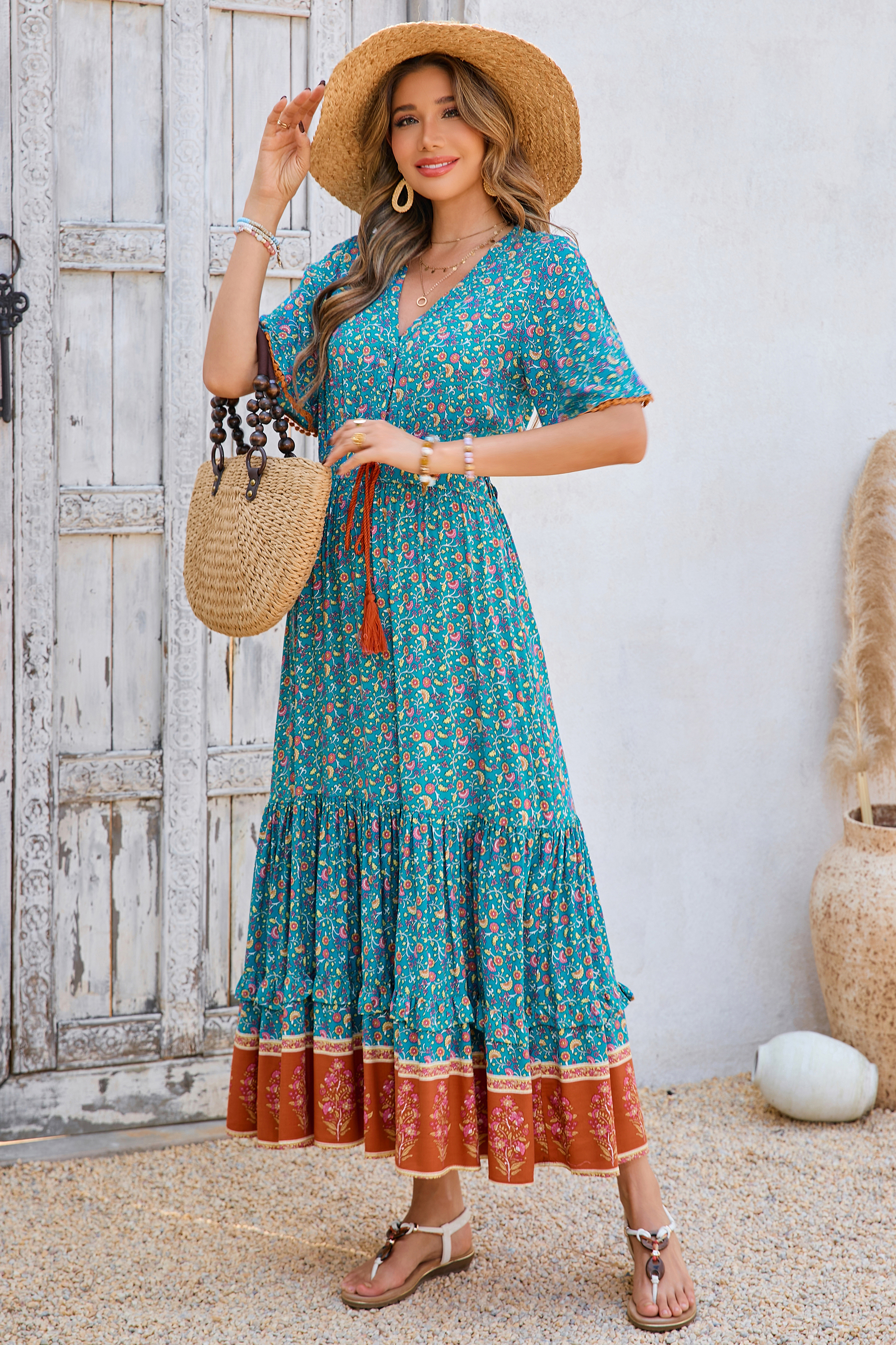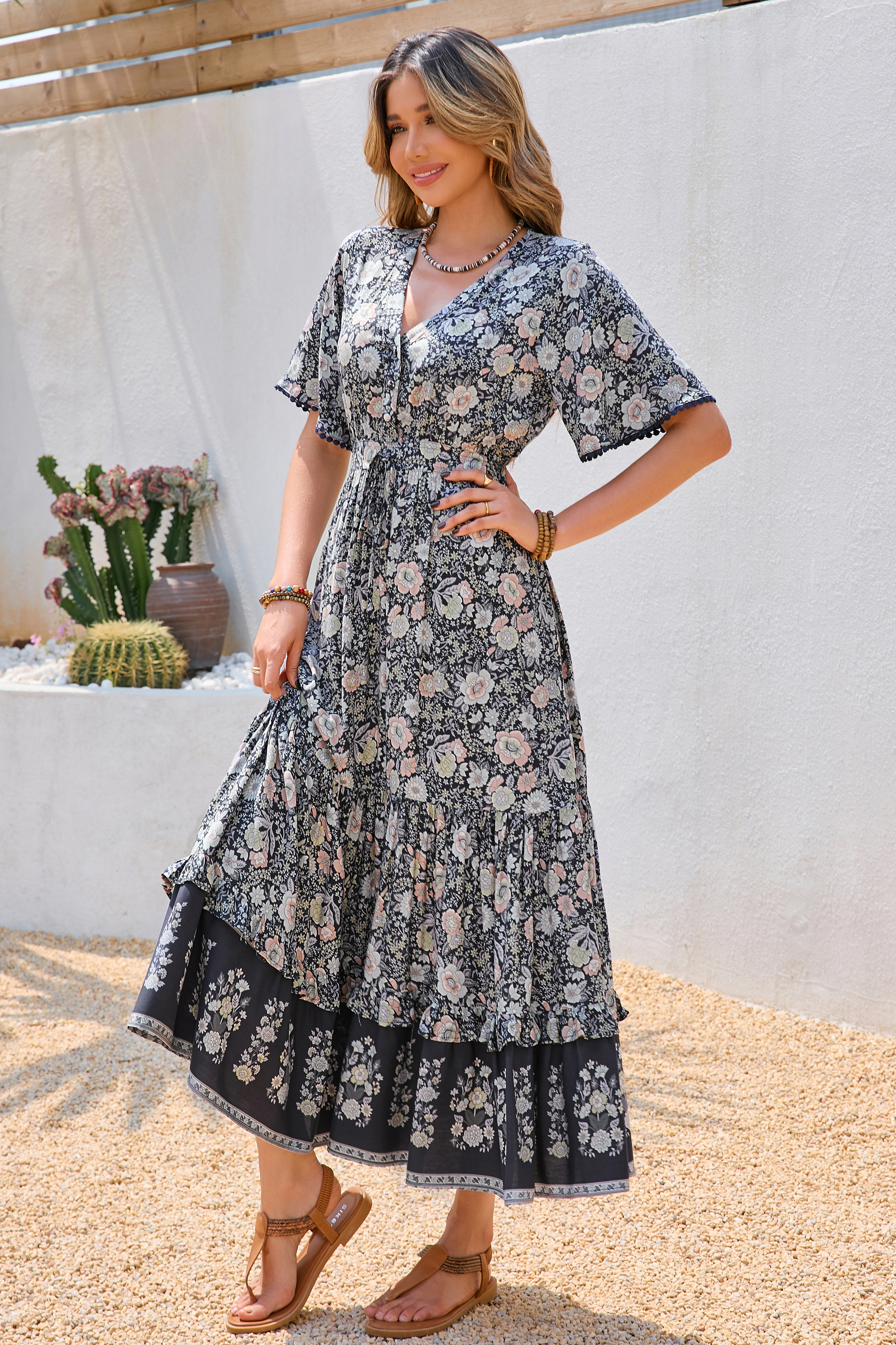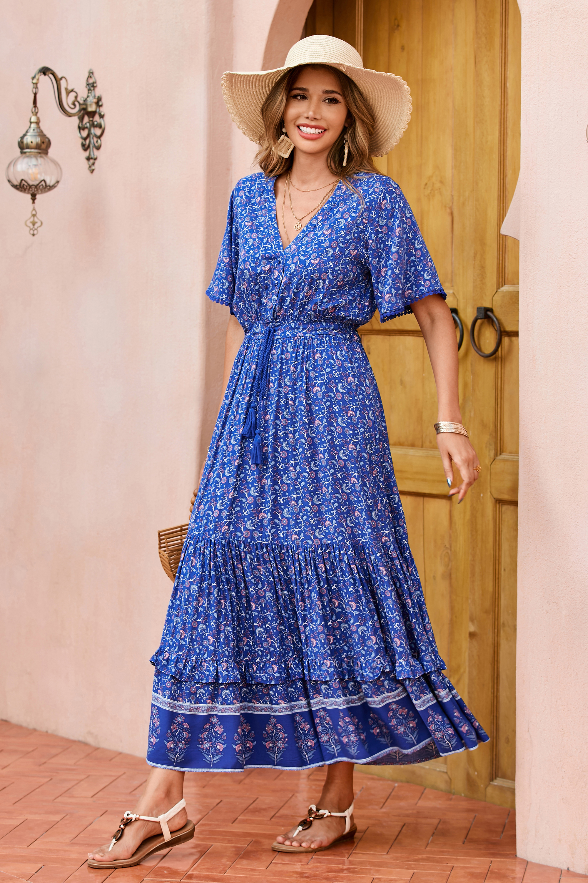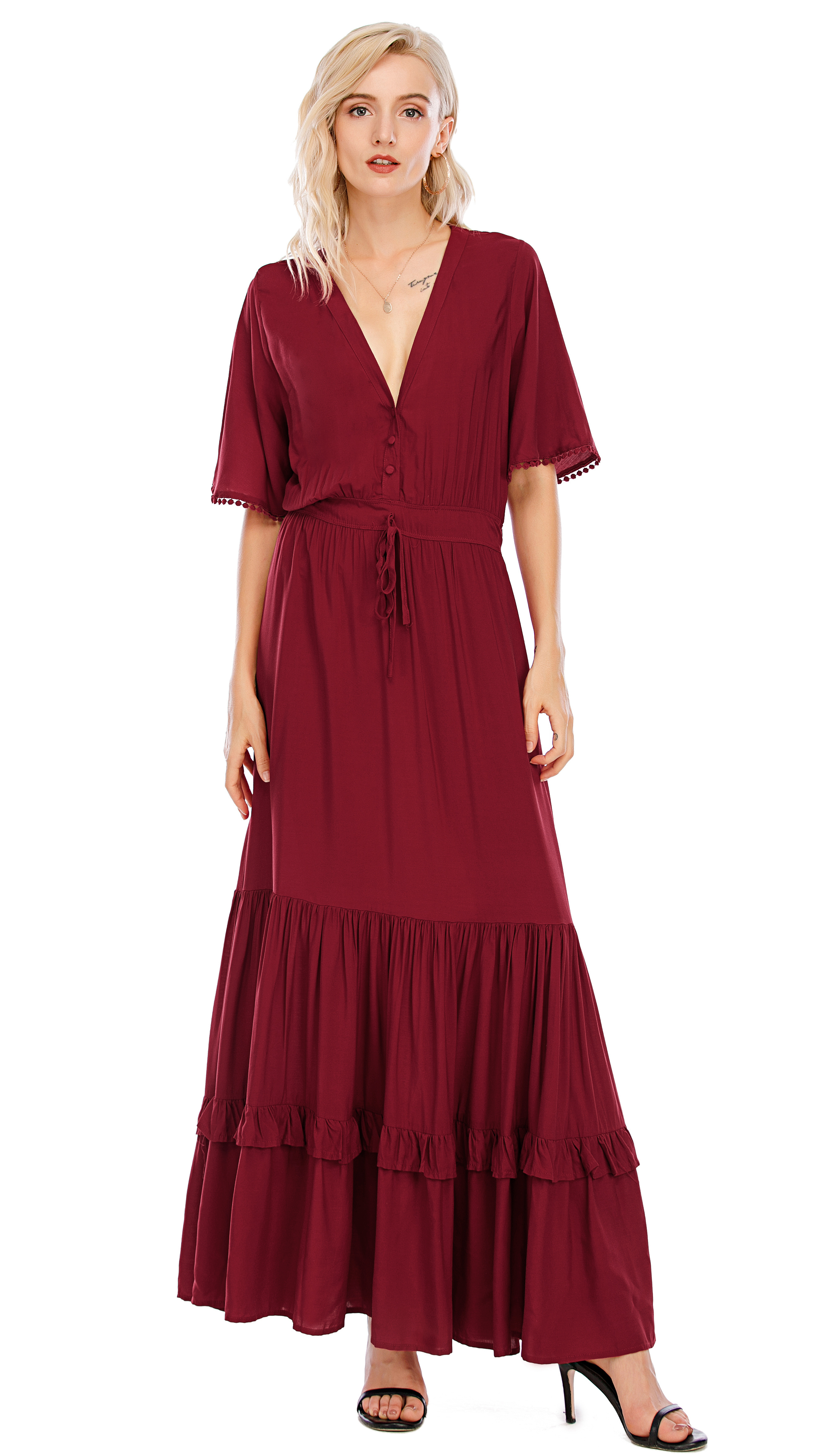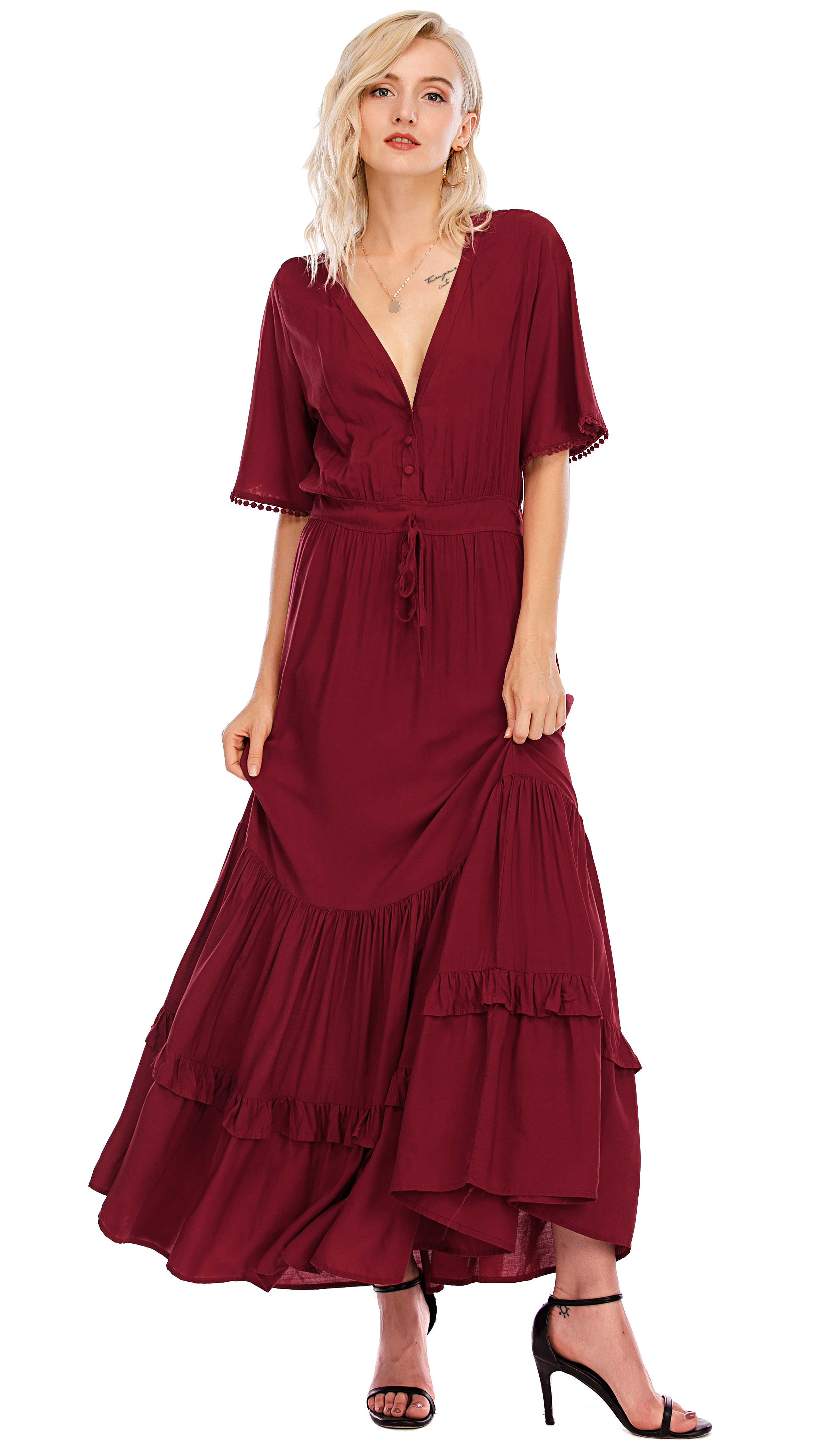 This tiered ruffle dress drapes beautifully, creating a flowy and relaxed fit that is both comfortable and casual. Versatile yet dressy style will make this a-line dress become an awesome addition if you are building your summer wardrobe!