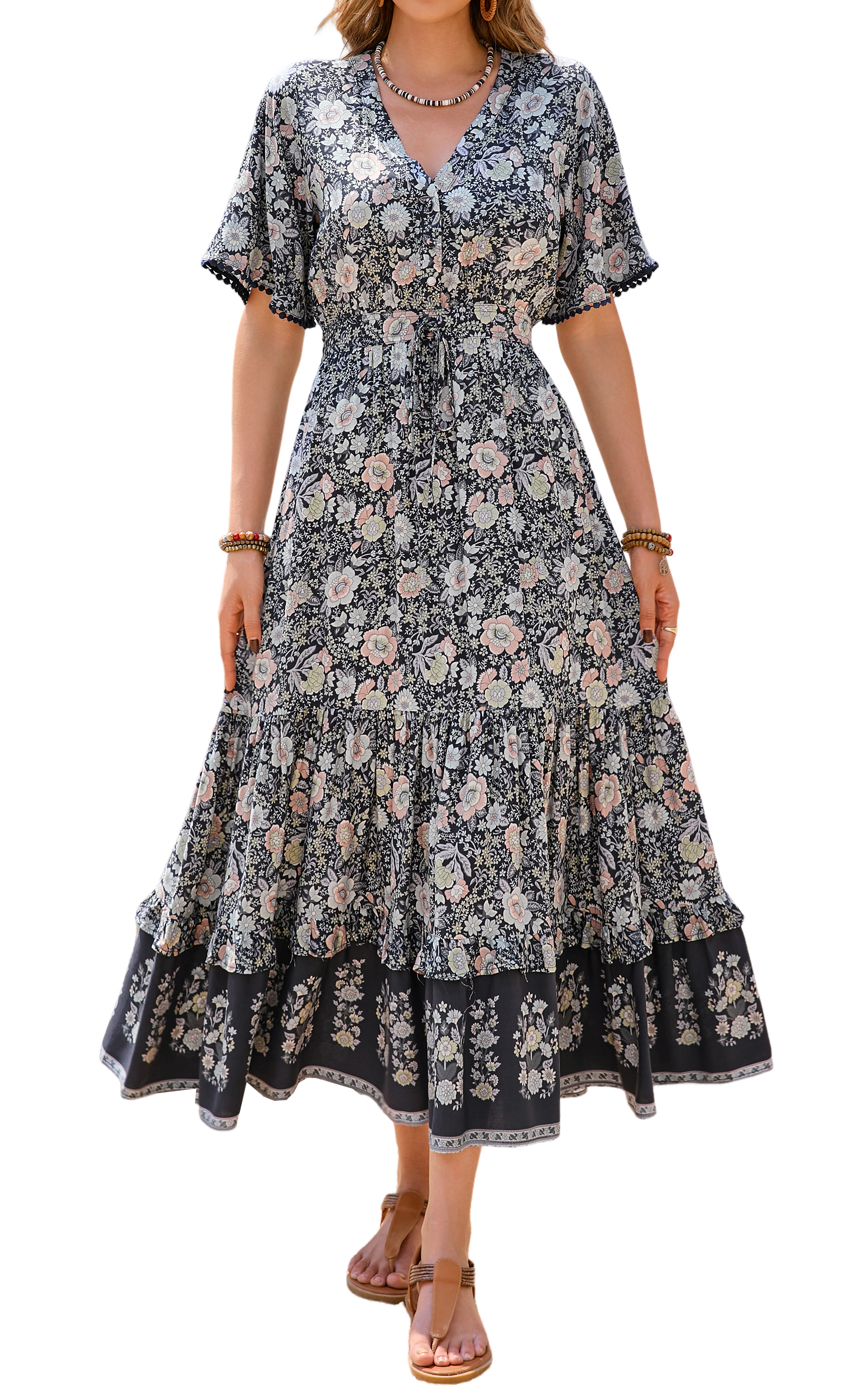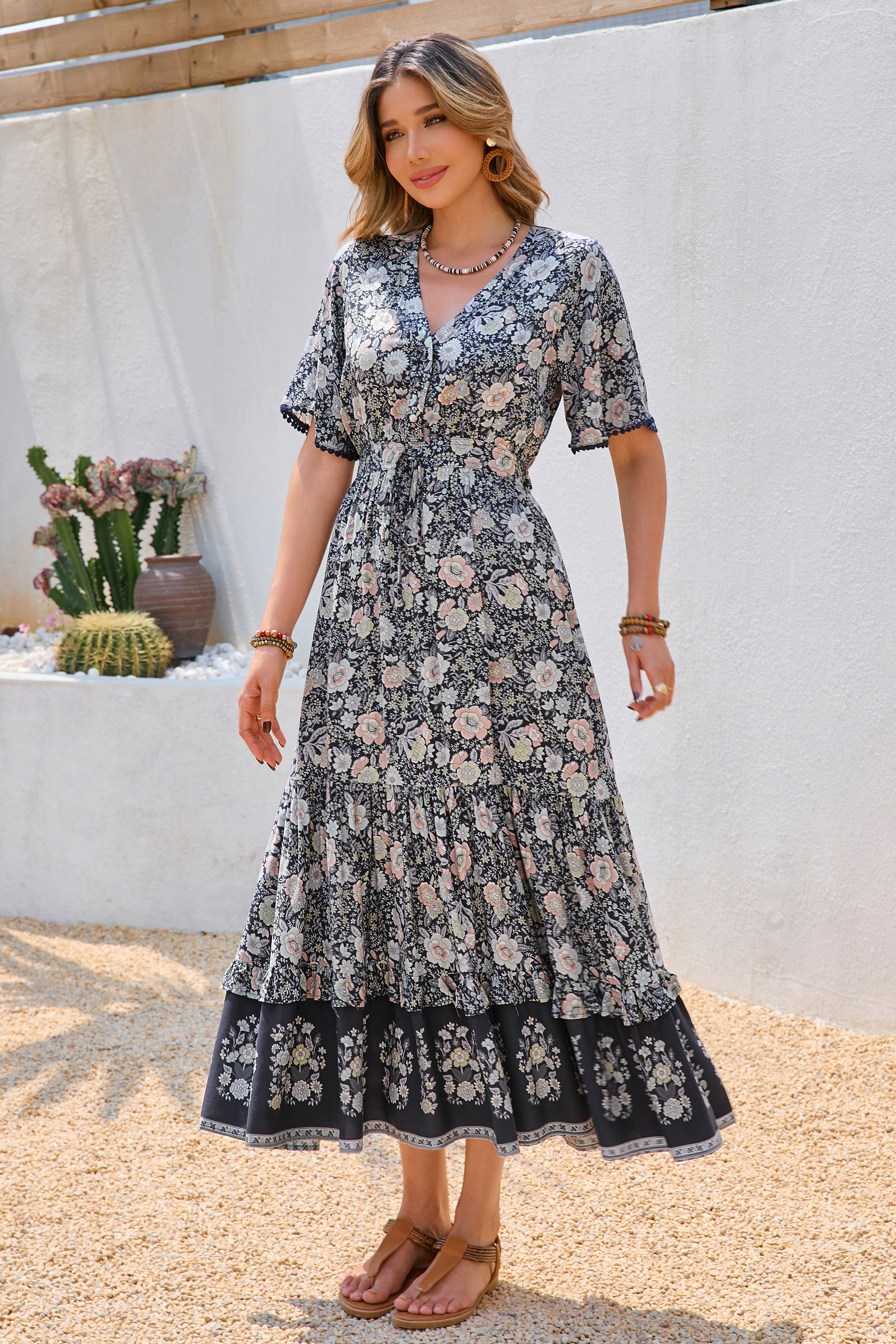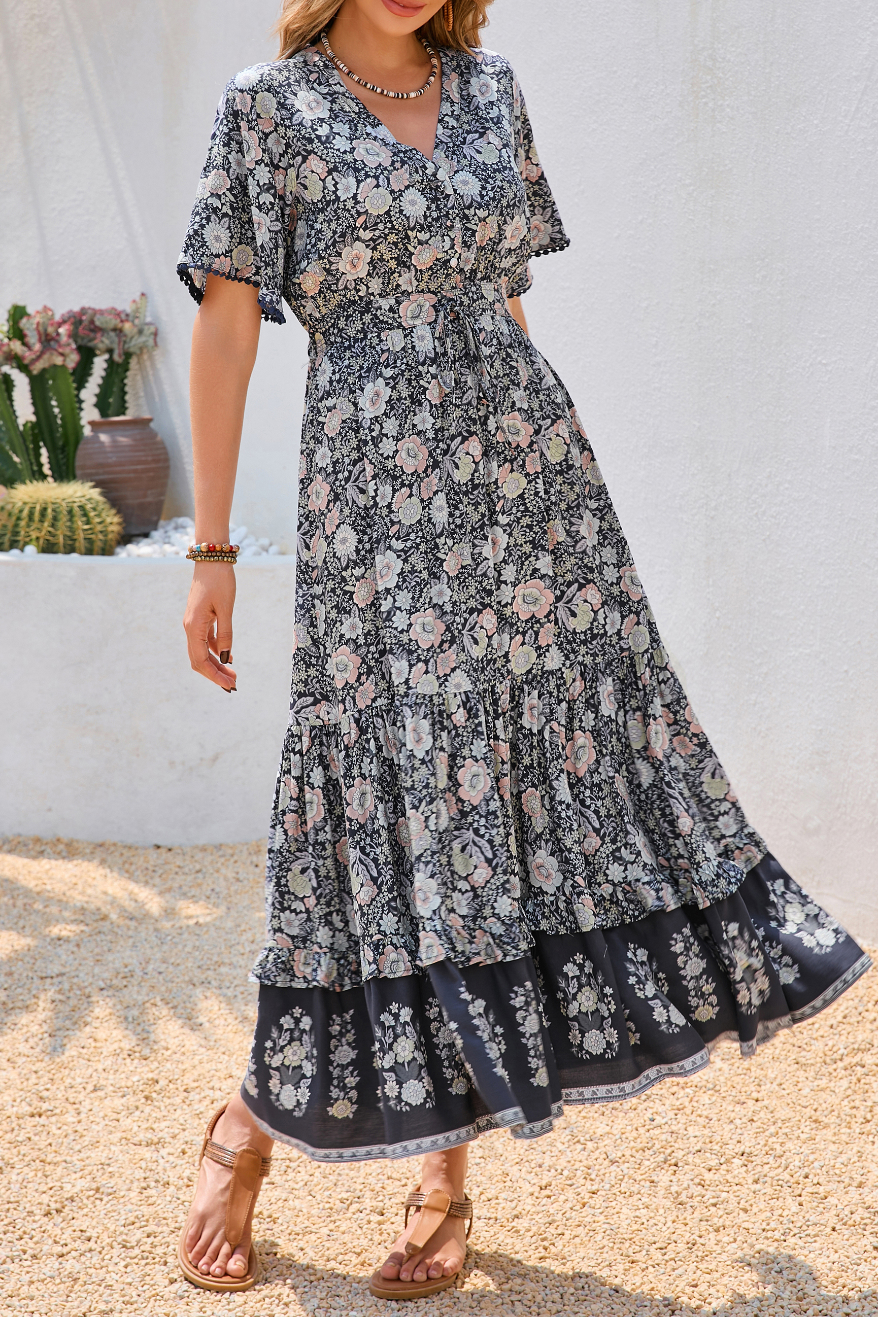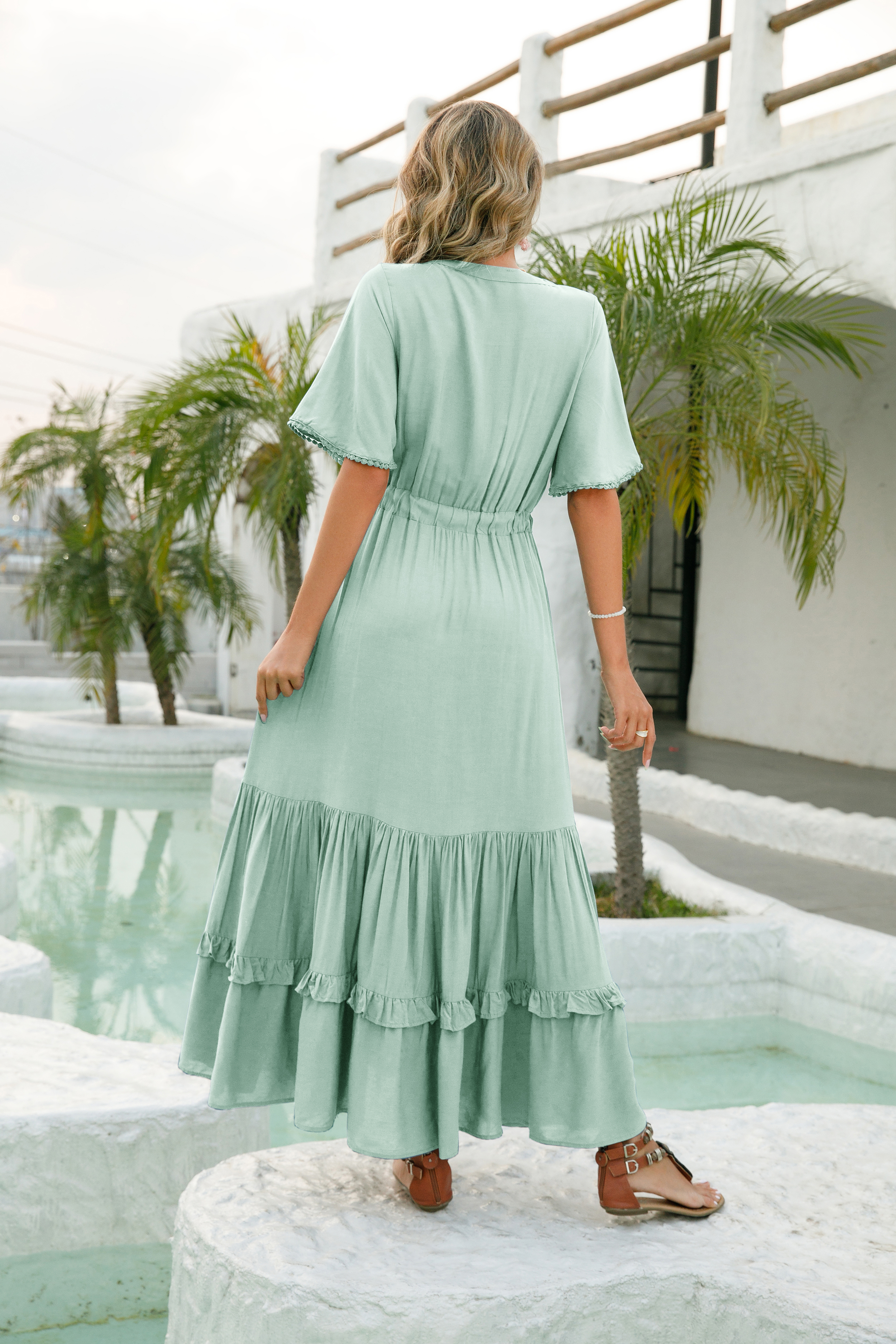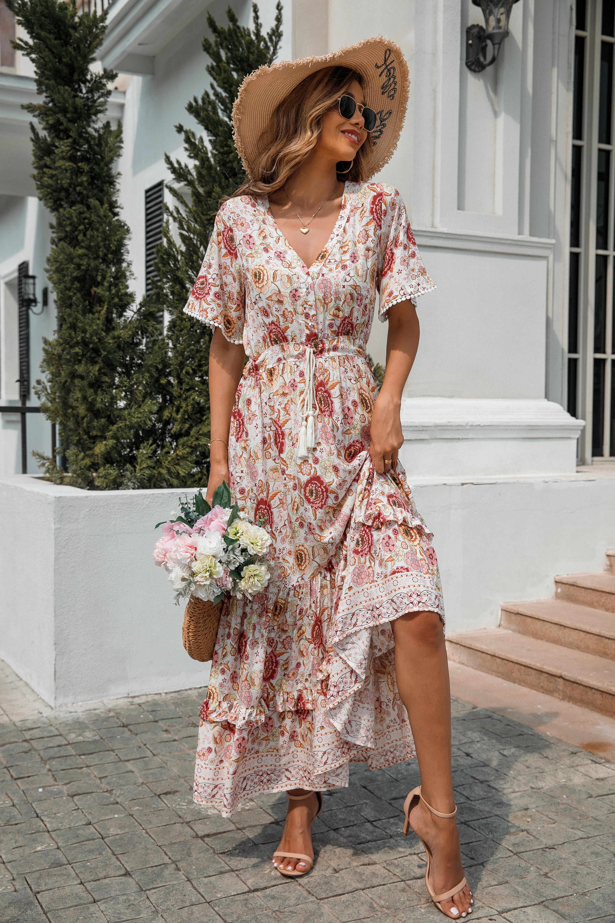 This tiered ruffle dress drapes beautifully, creating a flowy and relaxed fit that is both comfortable and casual. Versatile yet dressy style will make this a-line dress become an awesome addition if you are building your summer wardrobe!
