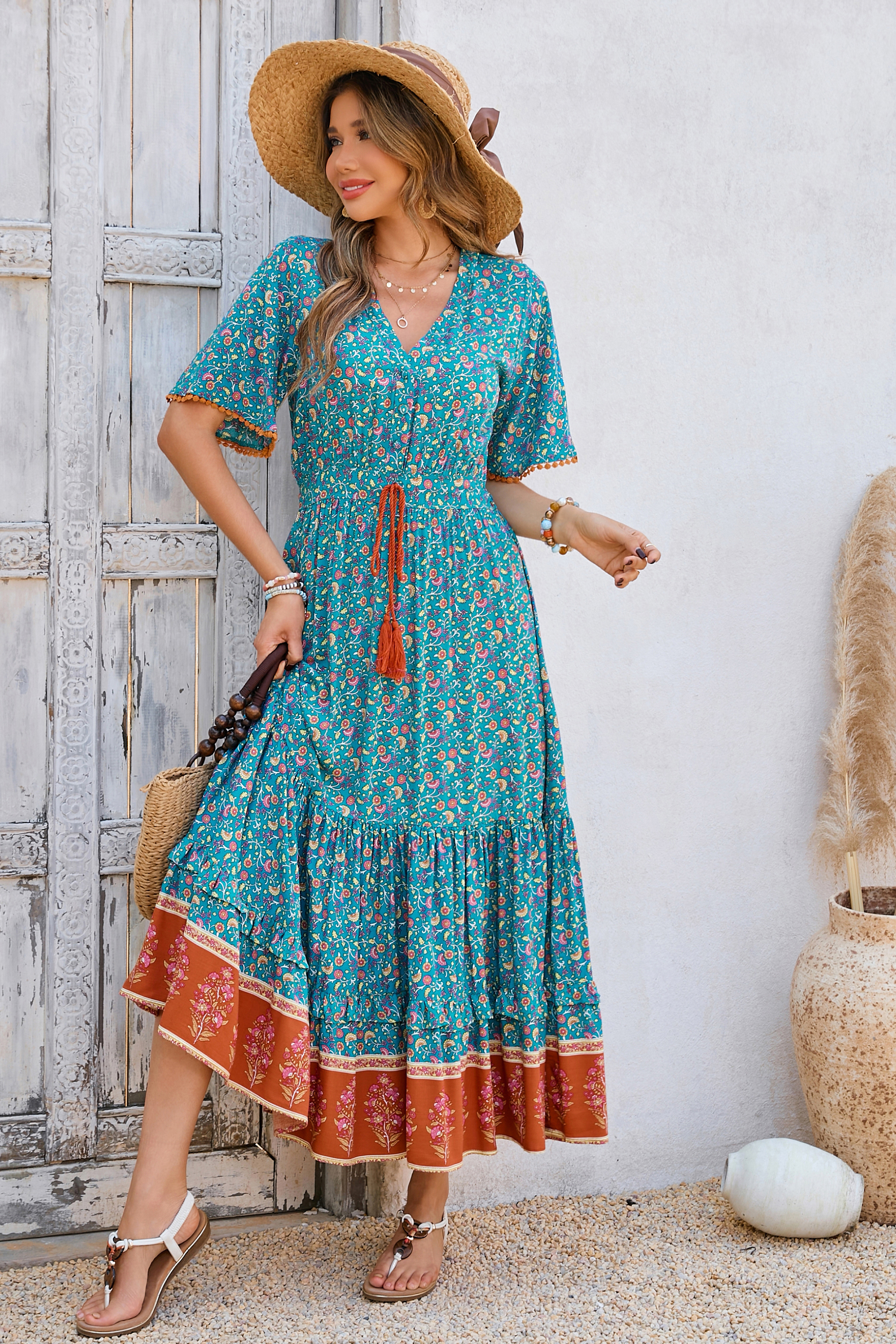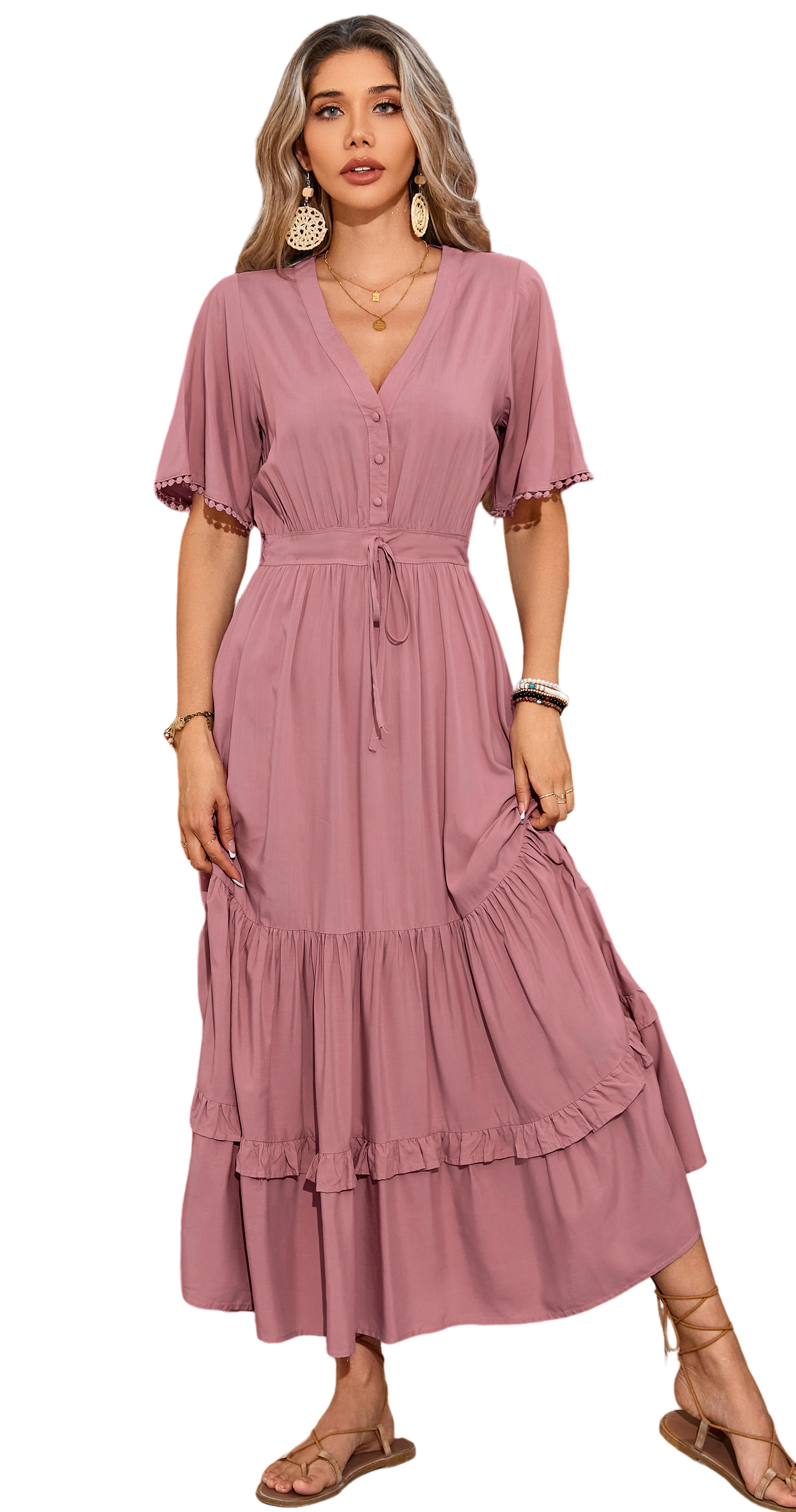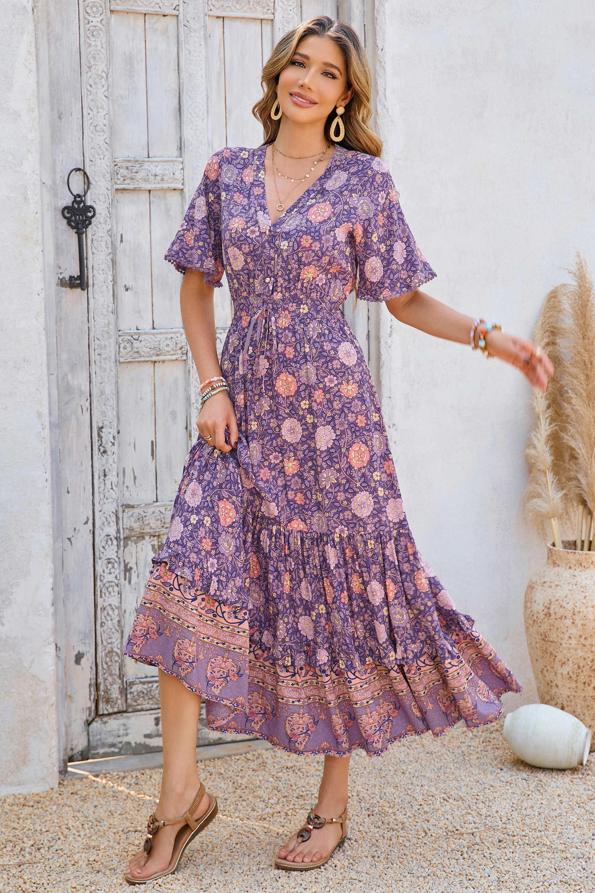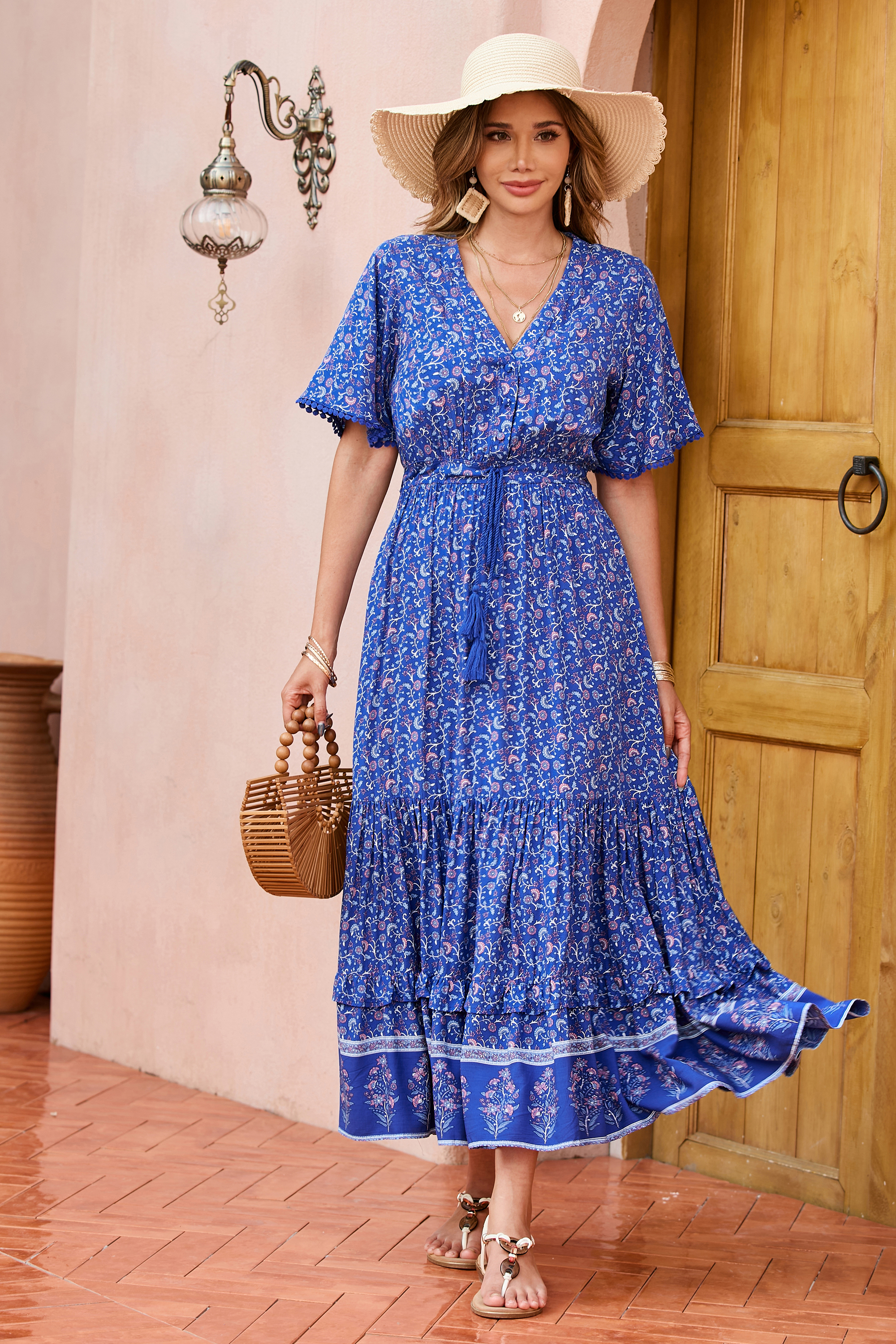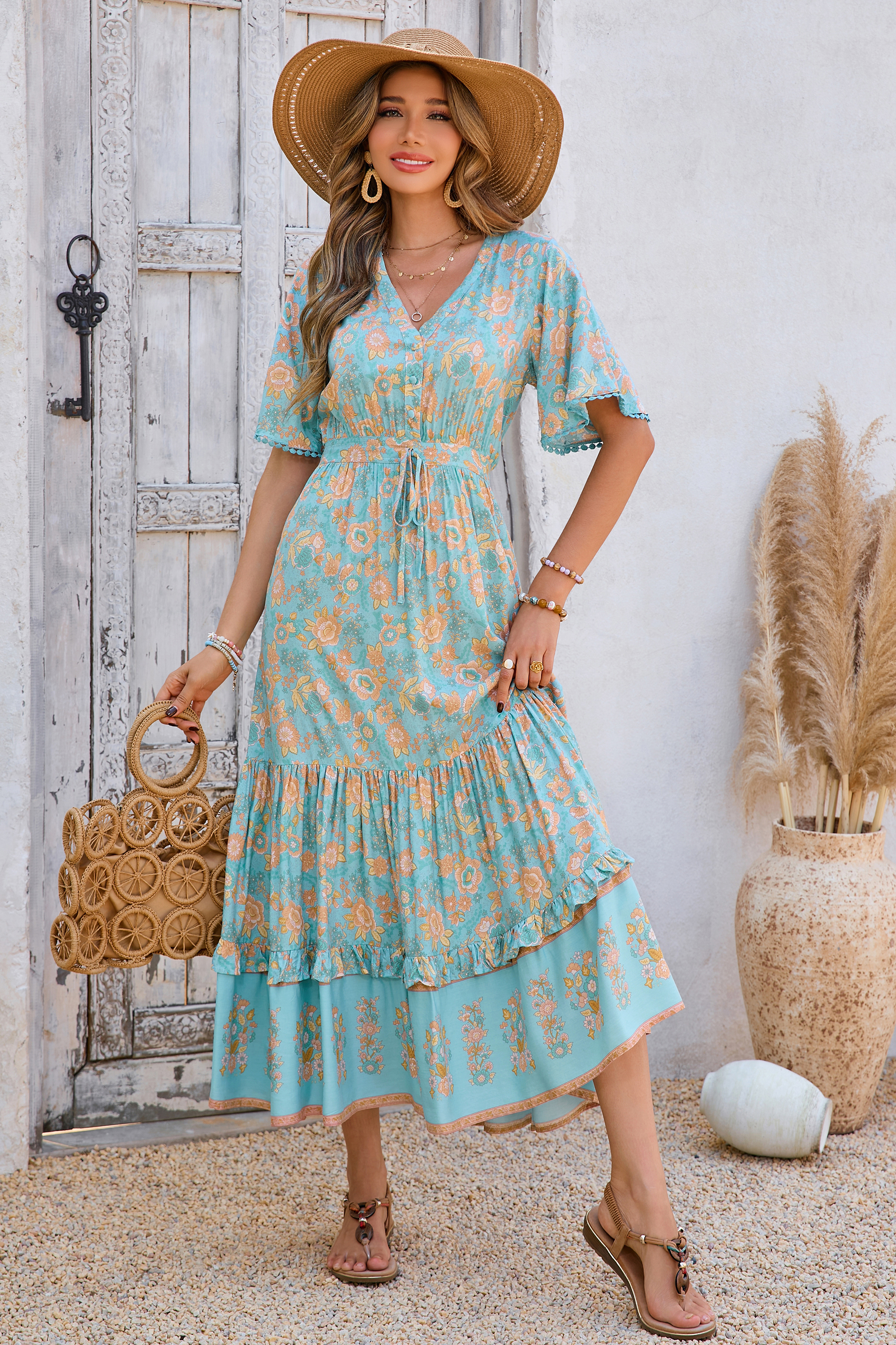 This tiered ruffle dress drapes beautifully, creating a flowy and relaxed fit that is both comfortable and casual. Versatile yet dressy style will make this a-line dress become an awesome addition if you are building your summer wardrobe!
