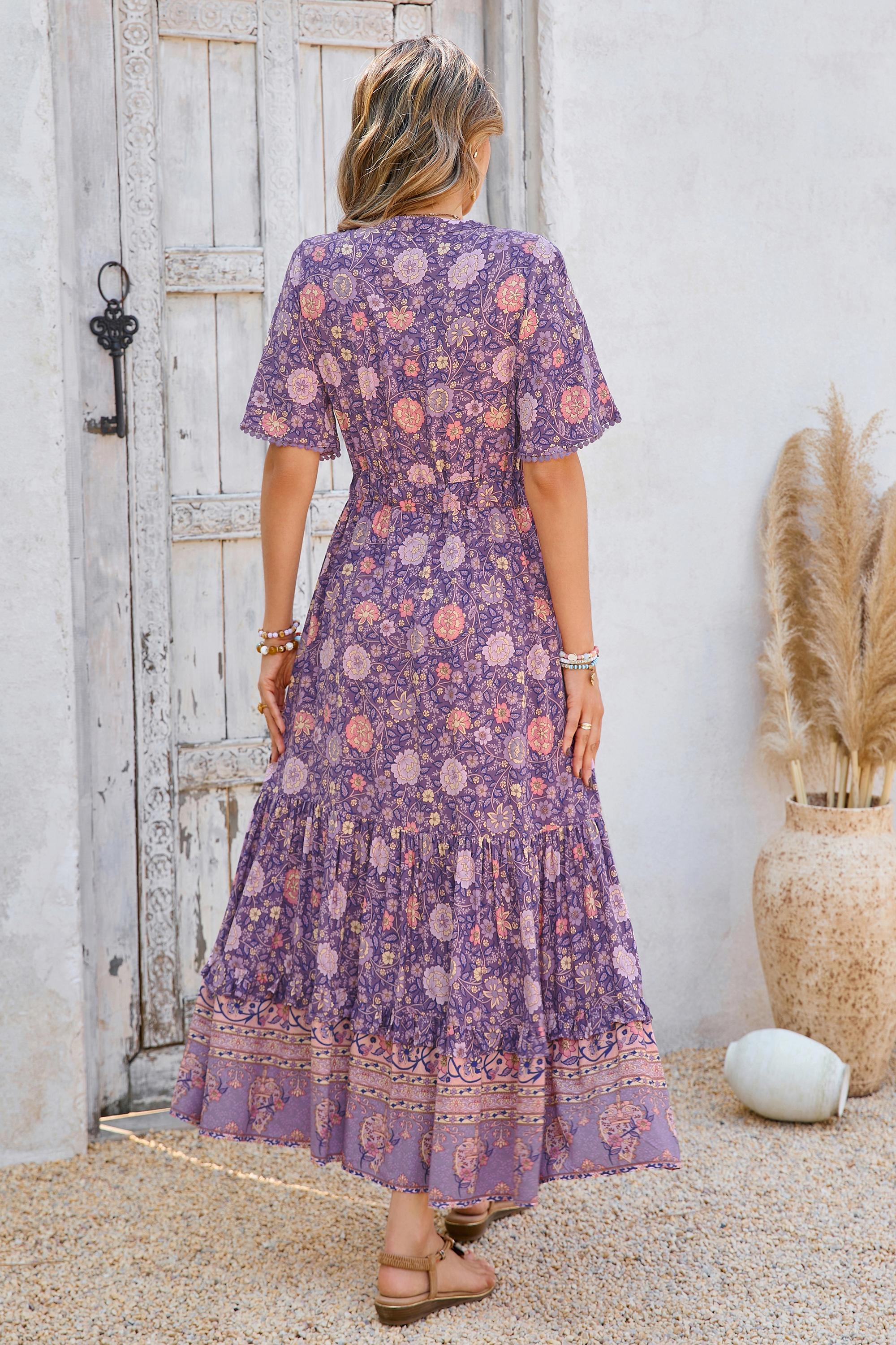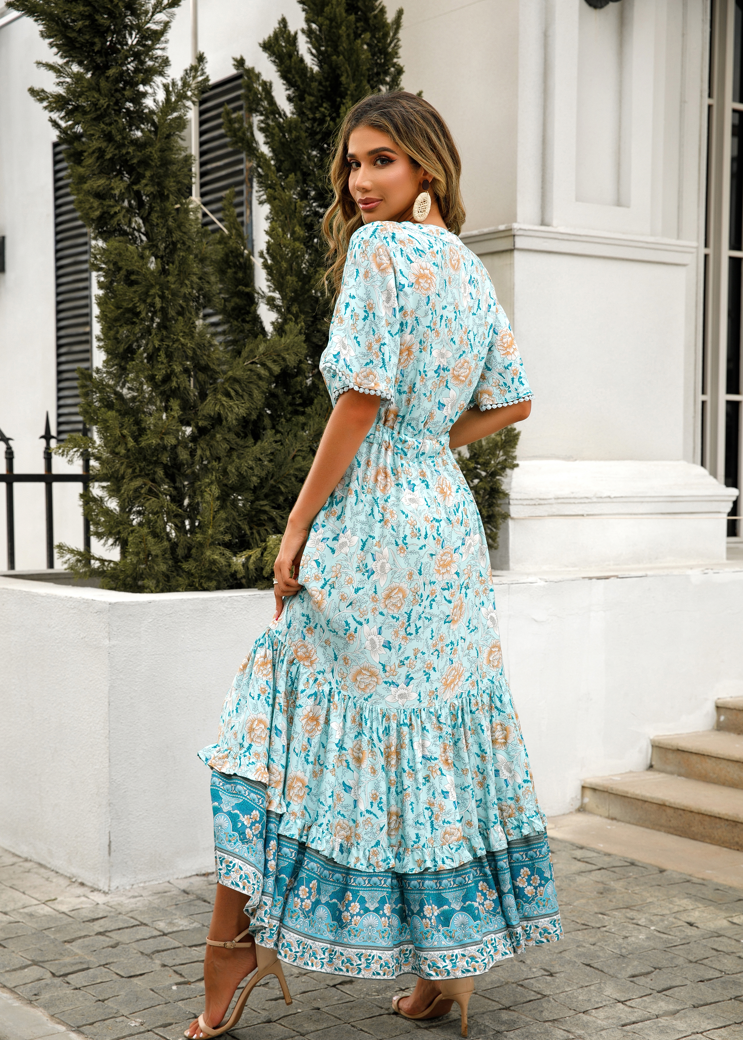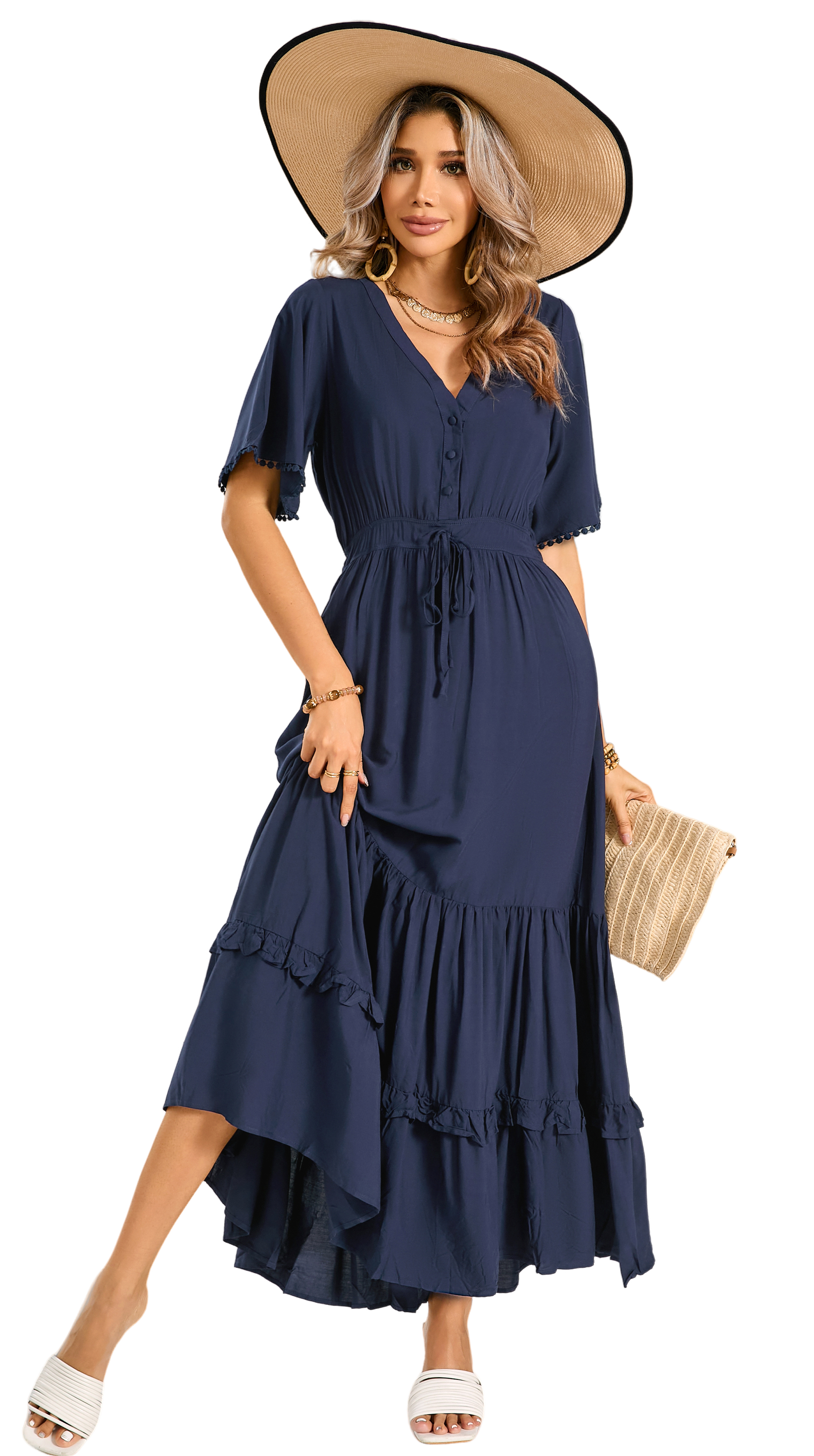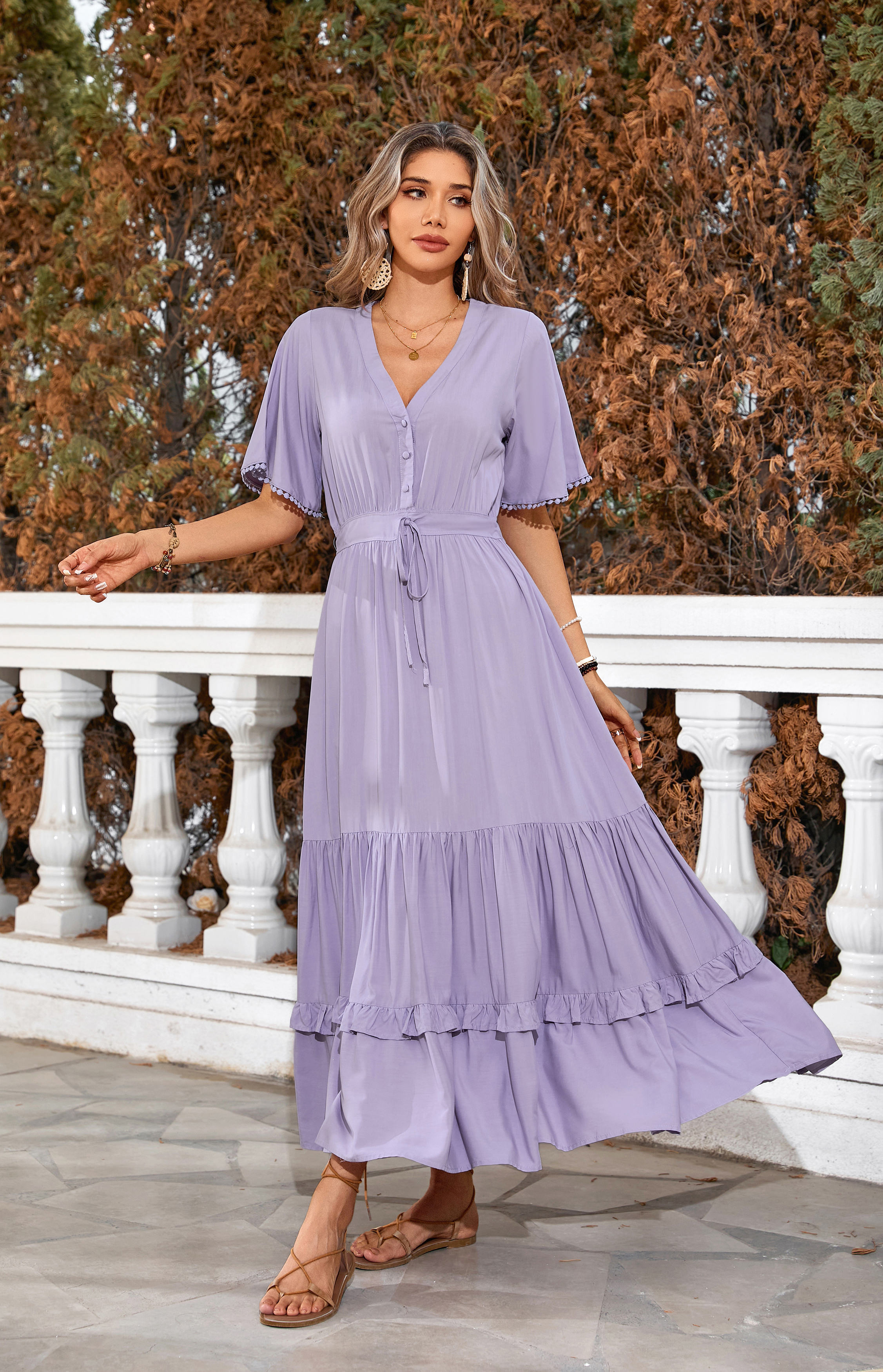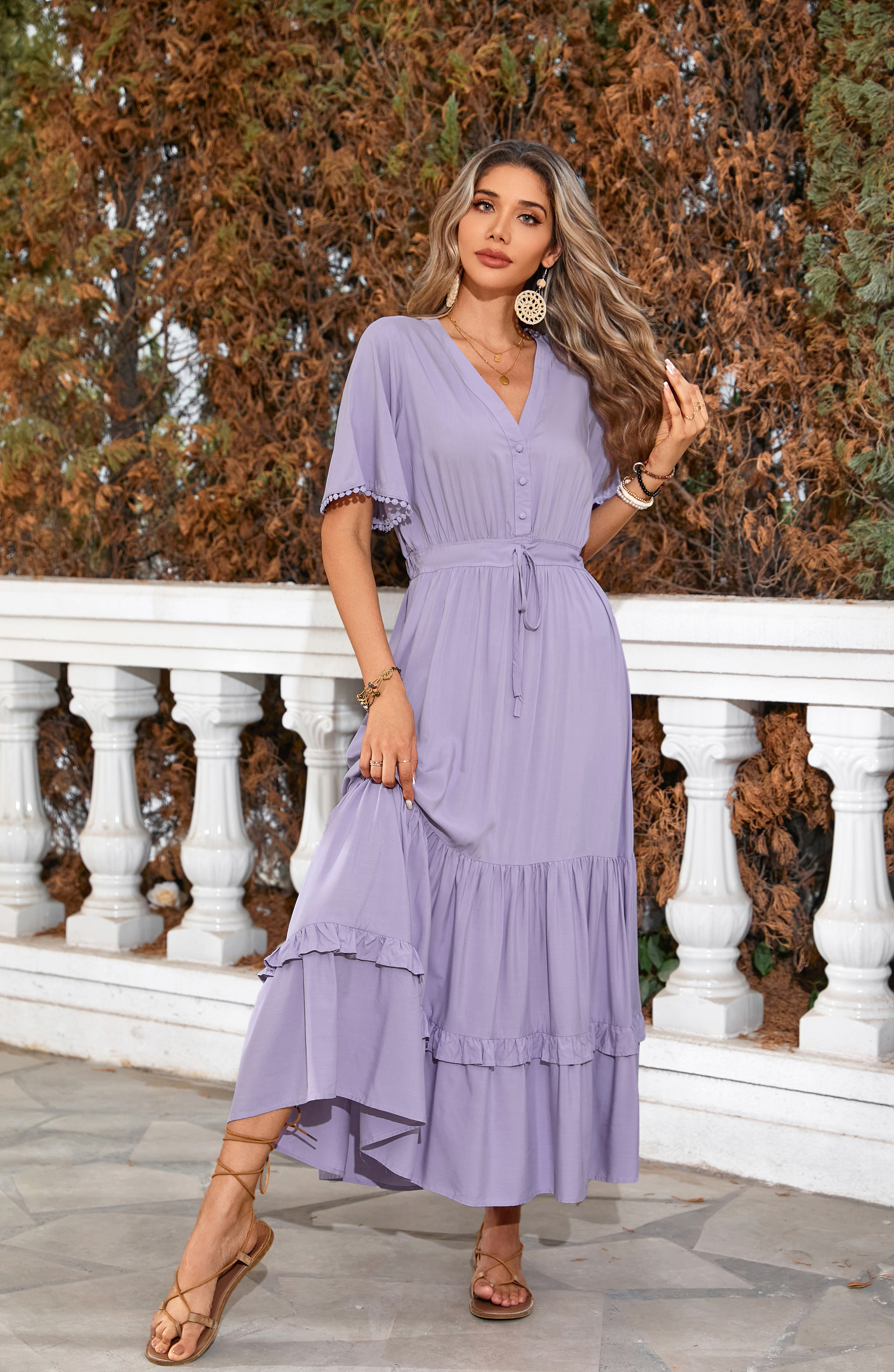 This tiered ruffle dress drapes beautifully, creating a flowy and relaxed fit that is both comfortable and casual. Versatile yet dressy style will make this a-line dress become an awesome addition if you are building your summer wardrobe!