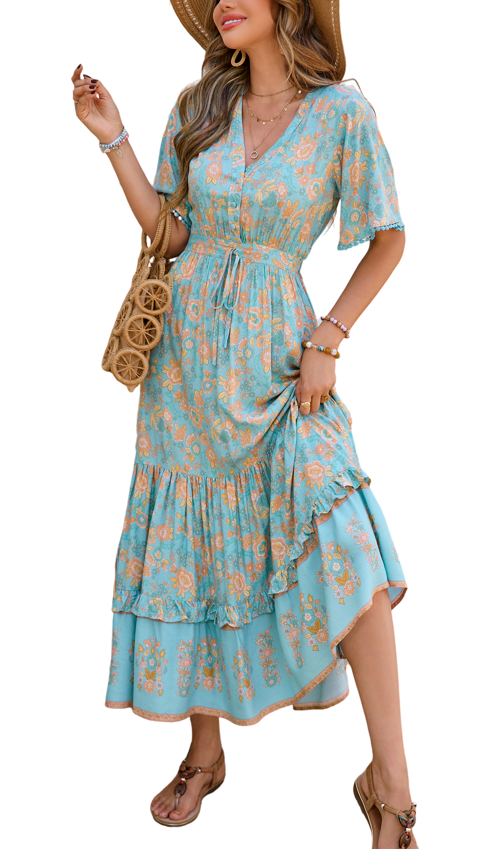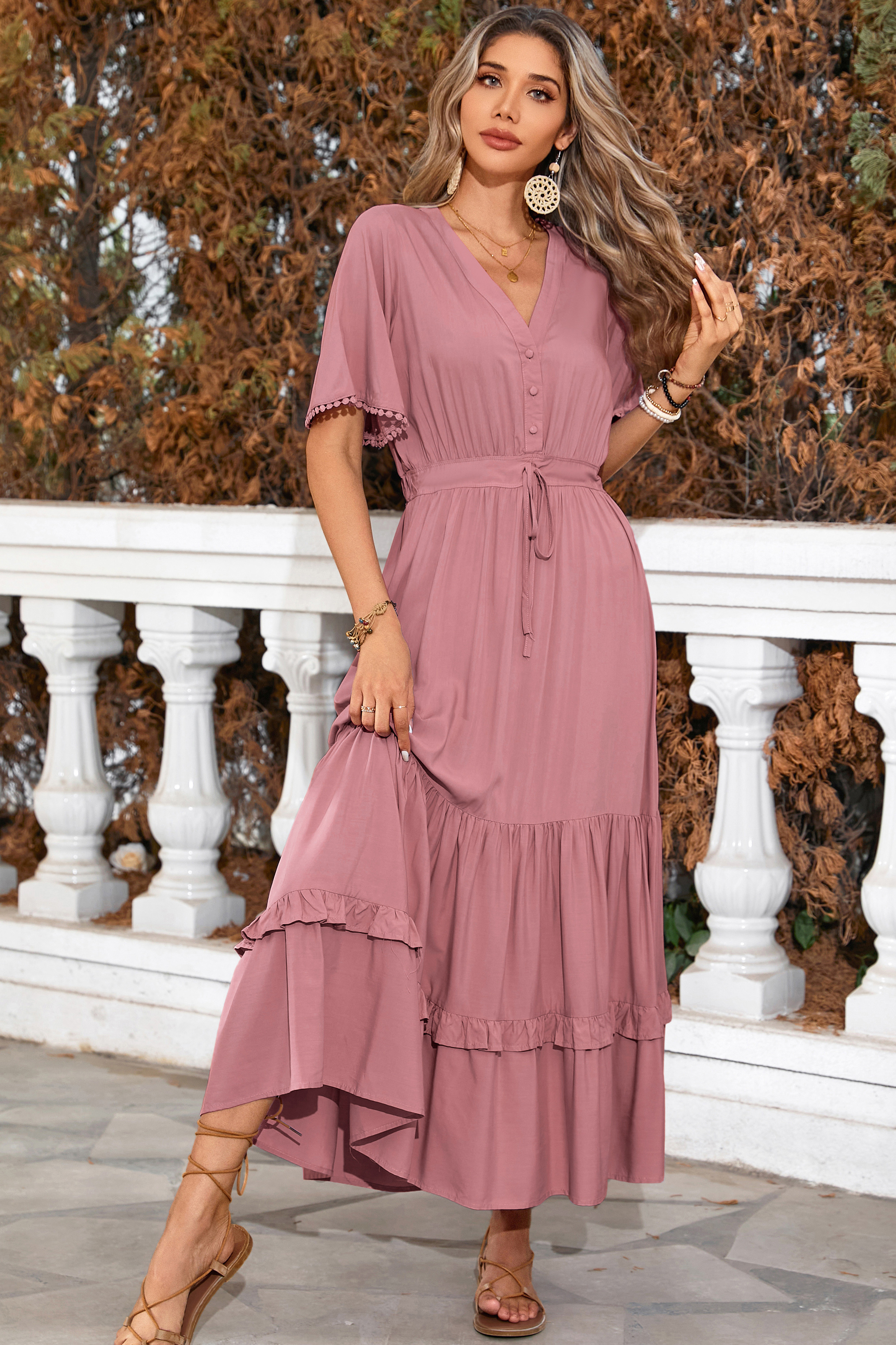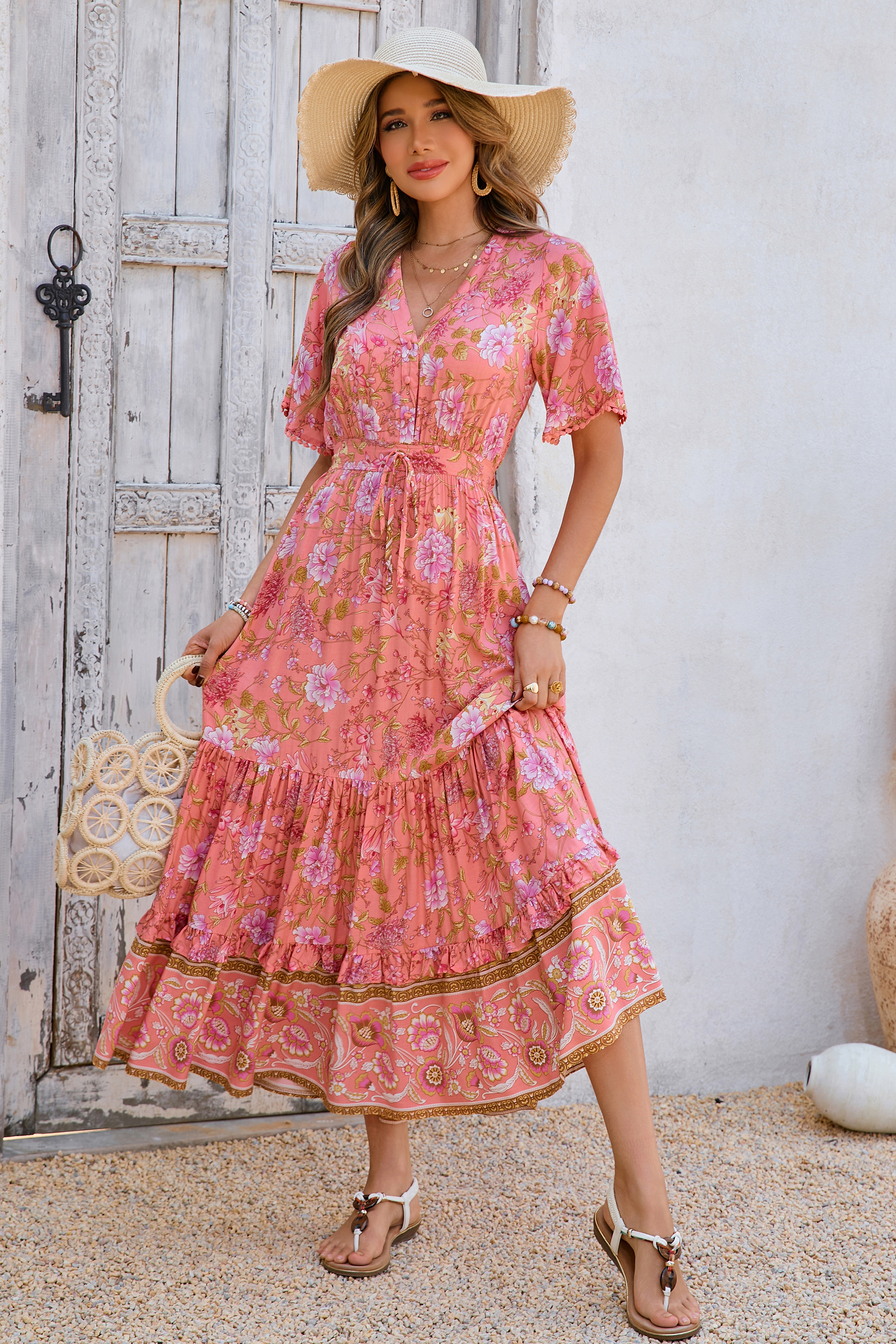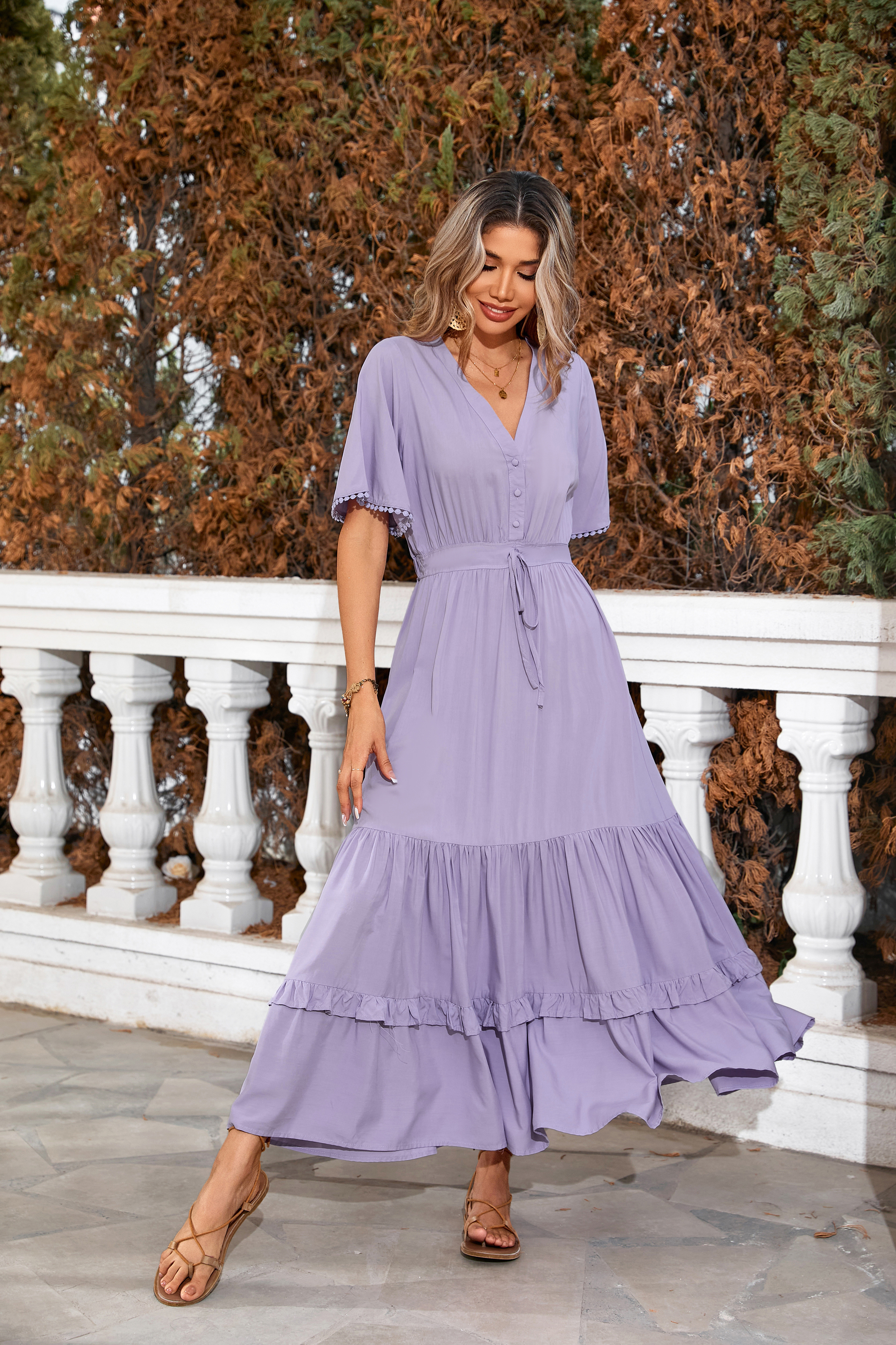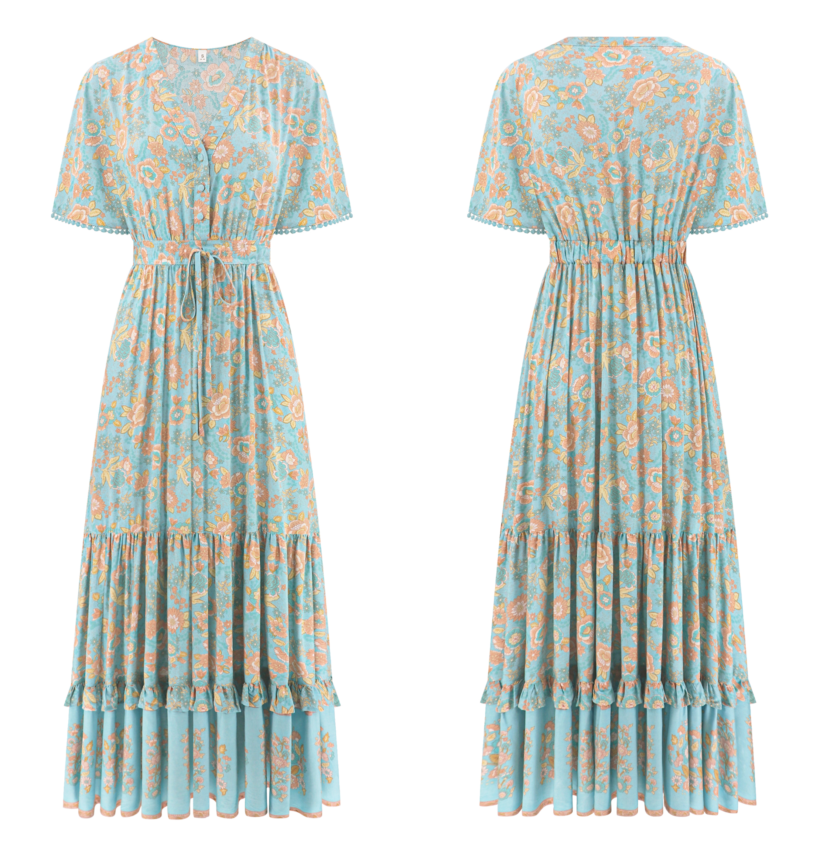 This tiered ruffle dress drapes beautifully, creating a flowy and relaxed fit that is both comfortable and casual. Versatile yet dressy style will make this a-line dress become an awesome addition if you are building your summer wardrobe!