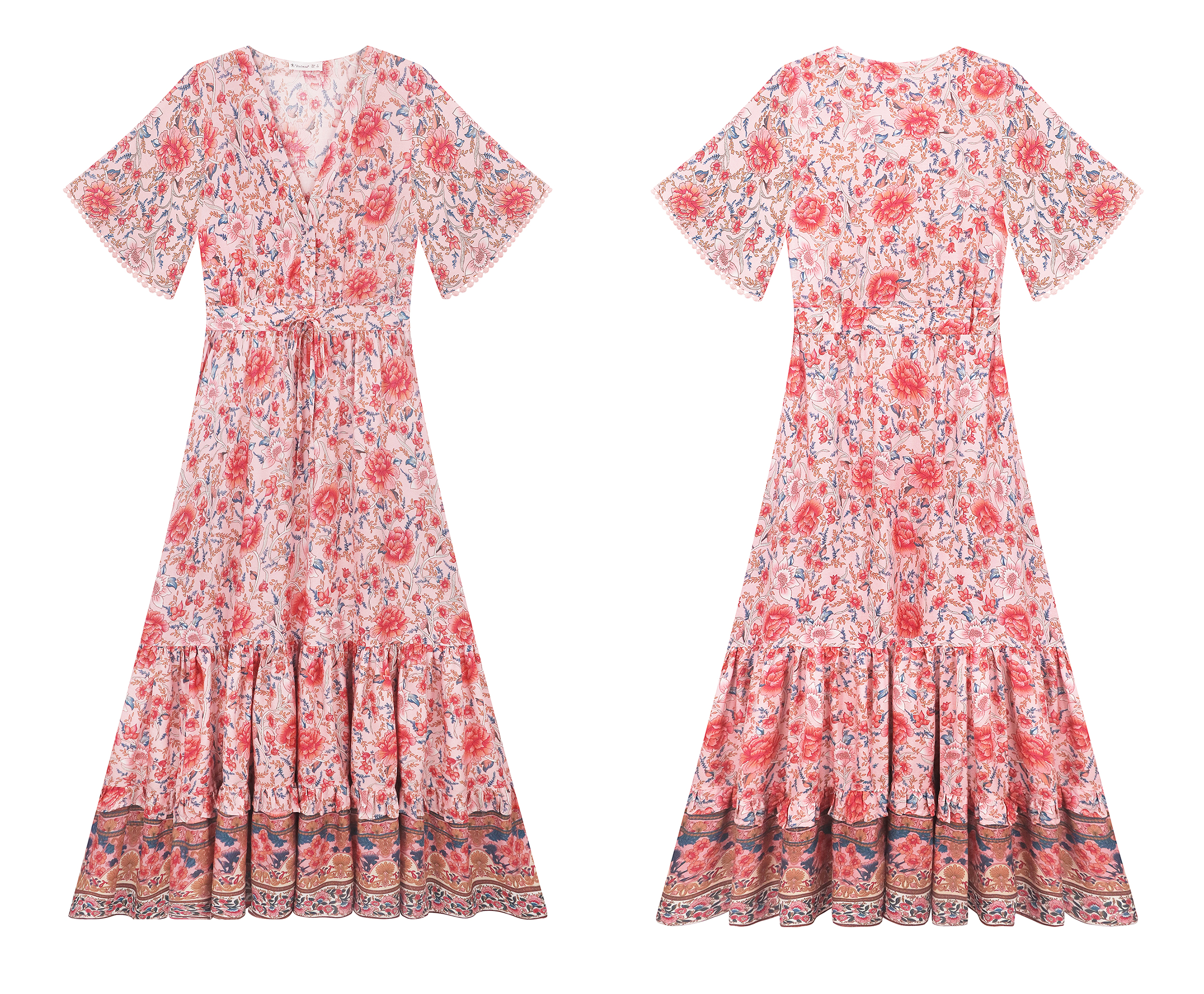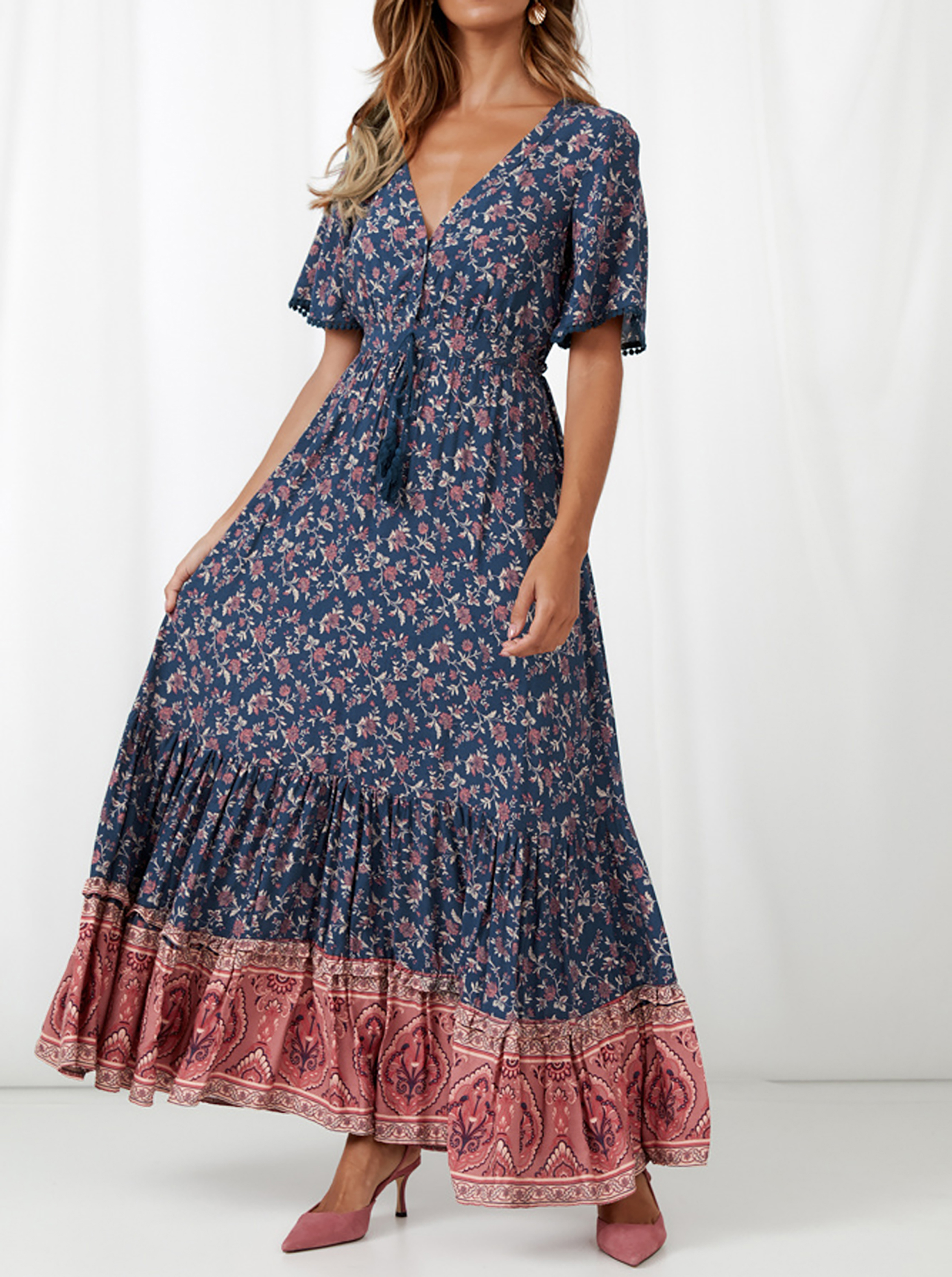The v neck dress is flattering and has a great flowing material. The drawstring tie at the waist allows this cute dress to flexibly fit your waist sizes and without being too tight, casual and versatile!