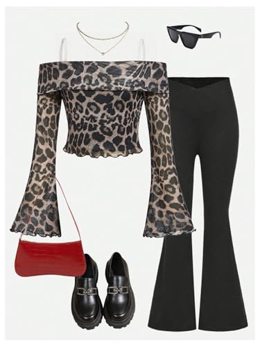Floerns Girl's Cheetah Print Off Shoulder T Shirts Flounce Long Sleeve Tee Tops 4