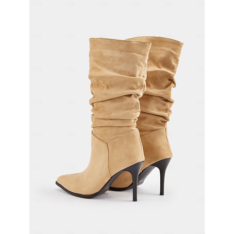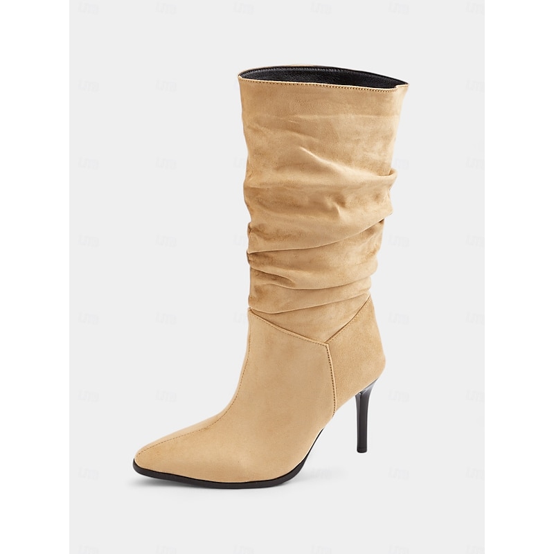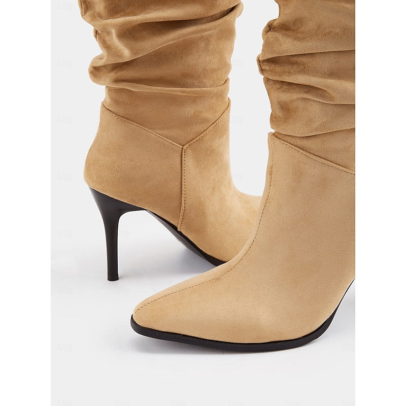 Highlights [Fabric] : Crafted from premium suede, these boots offer a soft and velvety texture, ensuring both comfort and luxury. The material's high-quality finish lends an elegant appearance suitable for any occasion. [Fit] : Designed with a classic slouchy fit, these knee-high boots provide a relaxed yet refined silhouette. The pointed toe and elongated stiletto heel add a touch of sophistication, perfect for elevating your style. [Design Highlights] : Featuring a sleek and pointed toe combined with a slender stiletto heel, these boots embody chic and modern elegance. The neutral tan shade enhances their versatility, making them easy to pair with a variety of outfits and perfect for effortless styling. [Occasions] : These boots are ideal for both casual and formal settings, seamlessly transitioning from daily wear to evening glamour. Whether heading to a weekend outing or an evening event, their stylish design makes a statement everywhere you go. [Size Notice] : Available in a range of sizes from US5.5 to US10.5, reflecting the standard fit so you can confidently select your usual size.