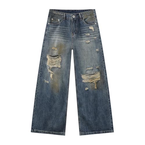 • **Features**: This pair of pants adopts a retro distressed style, fashionable holes, mopping length, wide-leg cut, comfortable and fashionable, suitable for all body types, natural and comfortable mid-rise