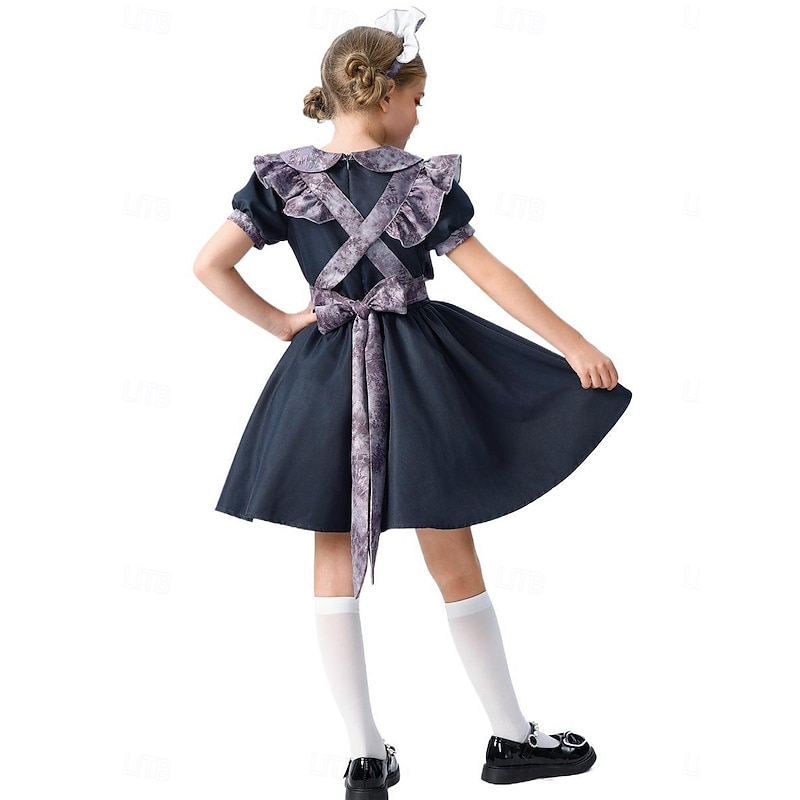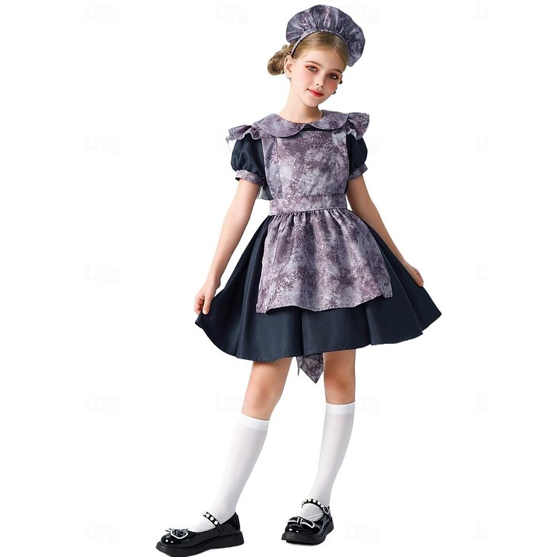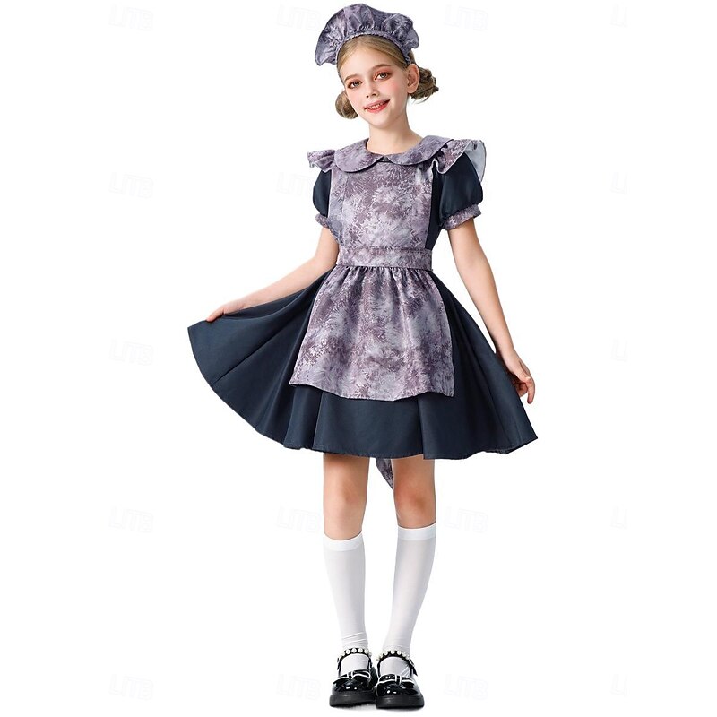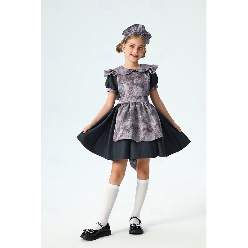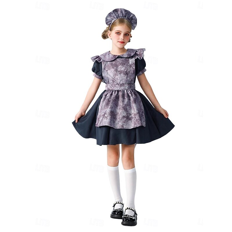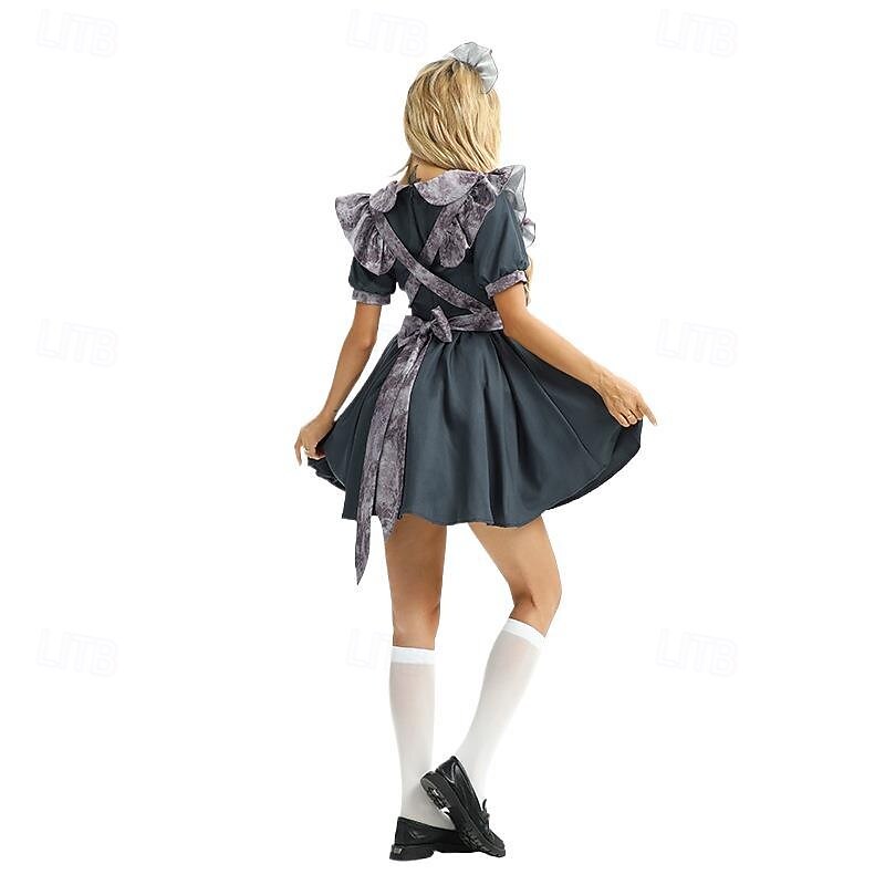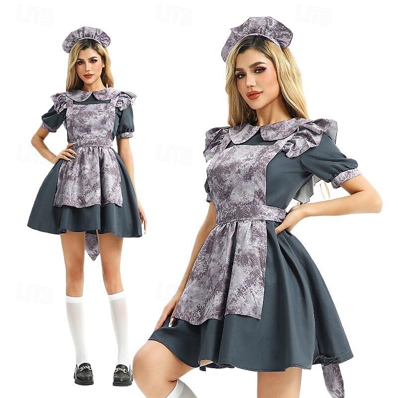 : This costume features a charming retro maid-style design with a flared skirt, providing a playful yet elegant silhouette. The ensemble is perfect for costume parties, themed events, or any festive gathering requiring a unique flair.