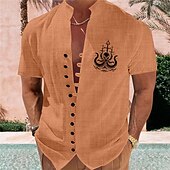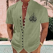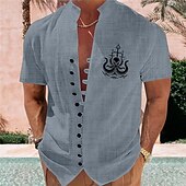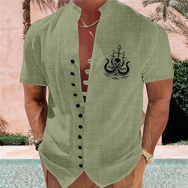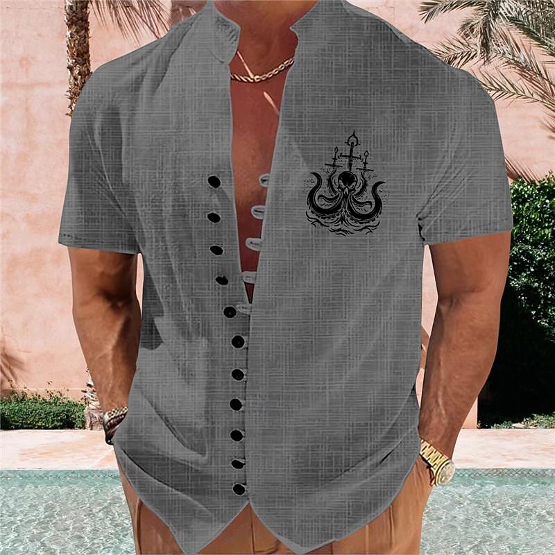 Highlights [Fabric] : Crafted from a high-quality polyester blend, this Men's Hawaiian Shirt is lightweight and breathable, offering micro-elasticity for added comfort during warm summer days. Its durable material ensures lasting wear, making it perfect for daily activities or vacation outings. [Fit Type] : Designed with a regular fit, this shirt provides a comfortable and relaxed silhouette suitable for a wide range of body types. The short sleeves are neatly hemmed for a clean finish, enhancing the overall laid-back vibe. [Design Highlights] : Featuring a stylish standing collar and a button-down front, this shirt is adorned with an intricate octopus print that exudes a fun, tropical flair. The subtle black buttons add a modern touch, while the embroidered motif on the chest adds a unique personal element to the design. [Occasions] : Ideal for various occasions, this shirt is versatile enough for daily wear, vacations, beach outings, or festive holiday gatherings. Its easygoing style makes it a go-to option for any casual or resort setting, providing both charm and comfort. [Size Range] : Available in a diverse range of sizes from S to 3XL, this shirt caters to a wide audience, ensuring a perfect fit for every wearer. The inclusive sizing guarantees that anyone can enjoy the ideal balance of style and comfort this shirt offers.