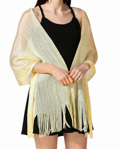 • Party Essential: Make a statement at any gathering with our Sparkling Metallic Shawl, a dressy shawl that sparkles with elegance. The mesh open-knit design, adorned with tassels and glittering metallic fabrics, makes you the focal point of the crowd. This elegant shawl for women is a must-have accessory, measuring 200 cm x 50 cm.