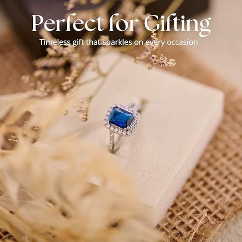 • STYLISH: This Simulated sapphire emerald cut ring features a 6x8mm emerald cut center stone, securely held in a classic prong setting. The halo is surrounded by 1.4mm CZ stones, while the band showcases pavé split shanks adorned with smaller round-cut stones in a prong set to add a touch of brilliance.