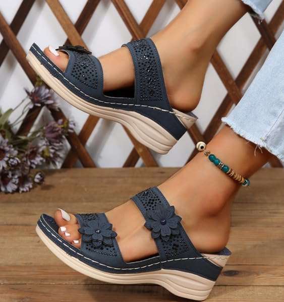 ZQW Women's Affordable Mid Wedge Heeled Sandals Open Toe Lightweight Floral Summer Slides Comfortable Casual Beach Shoes 5