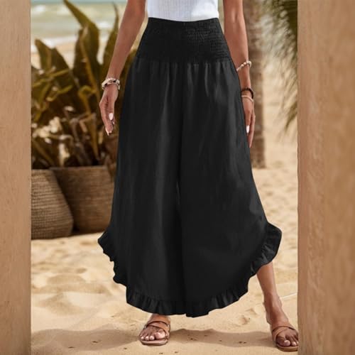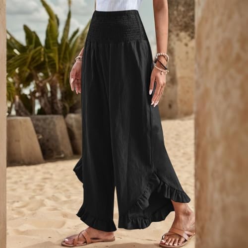 HOT ! Summer Wide Leg Linen Pants for Women Smocked Waist Ruffle Palazzo Pants Boho Flowy Casual Beach Trousers with Pockets