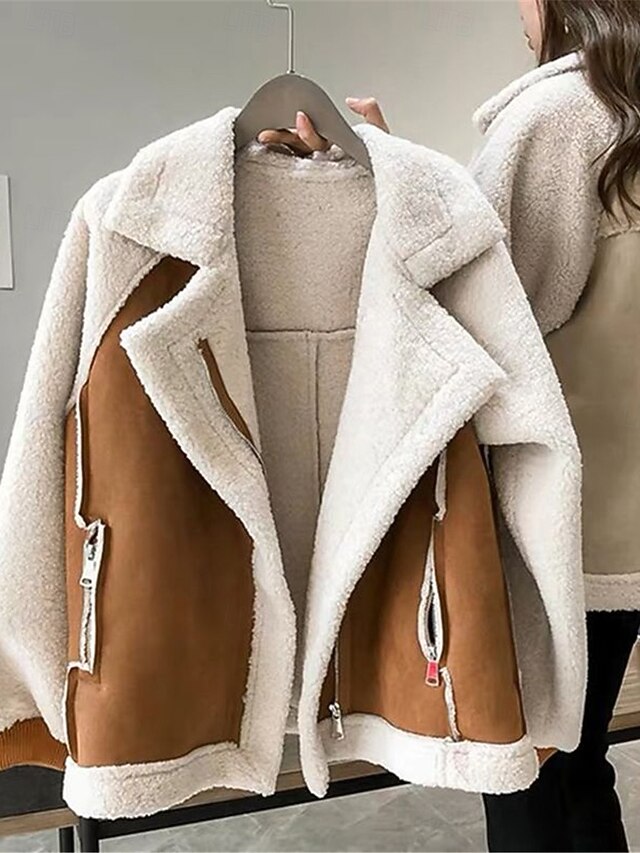 More information about Women's Fleece Jacket Teddy Coat Warm Breathable Zipper Pocket Fleece Lined Casual Plain Vacation Street Daily Wear Going out Zipper Regular Turndown Regular Fit Long Sleeve Outerwear Brown Khaki