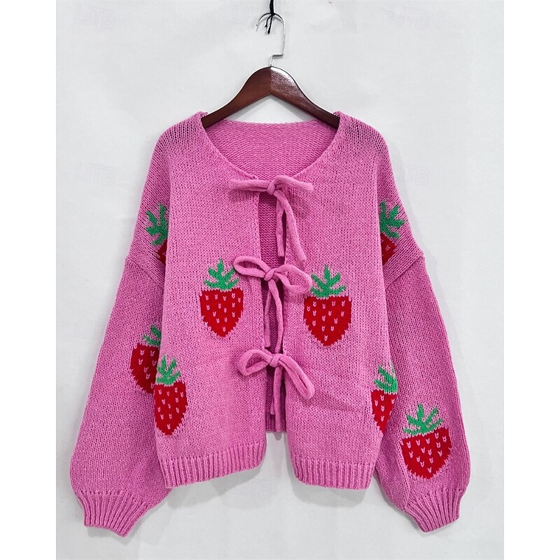Women's Sweater Cardigan Streetwear Casual Heart Fruit Crew Neck Knitted Print Long Sleeve Regular Tops Knit Daily Holiday Going out Pink Dusty Rose Fall Winter 26