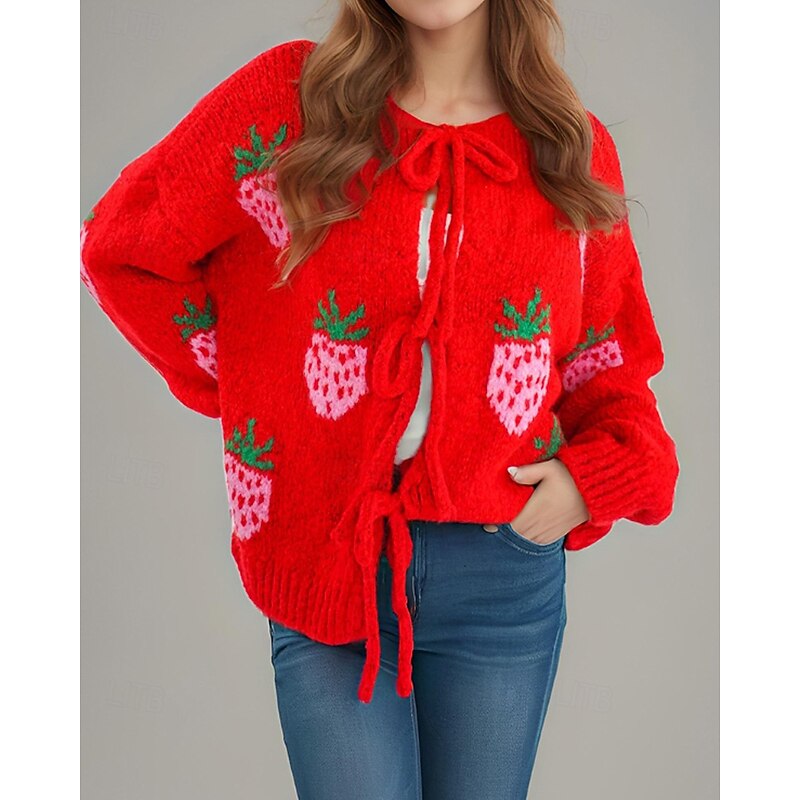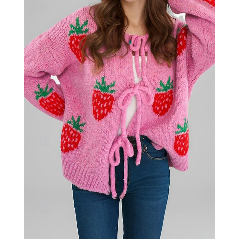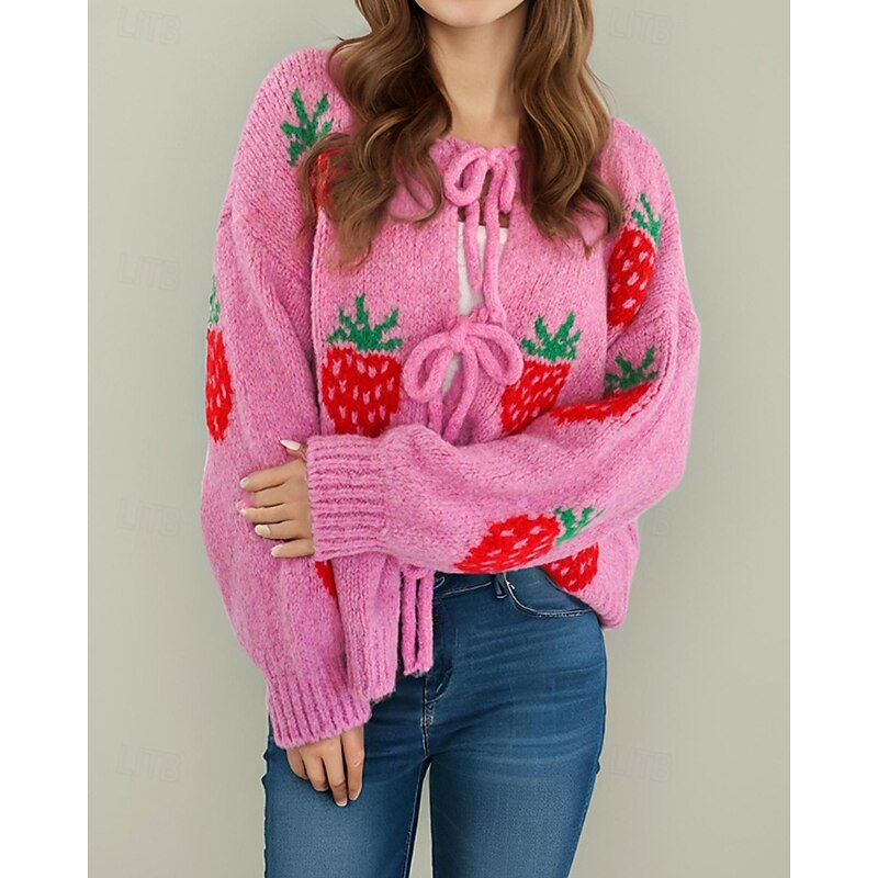 Women's Sweater Cardigan Streetwear Casual Heart Fruit Crew Neck Knitted Print Long Sleeve Regular Tops Knit Daily Holiday Going out Pink Dusty Rose Fall Winter 23
