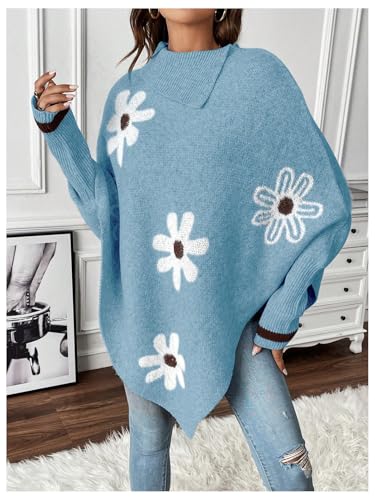 HOT ! Women's Floral Poncho Sweater Long Sleeve Turtleneck Chunky Oversized Sweater Trendy Fall Winter Pullover Top