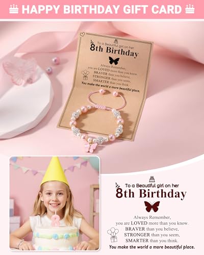 • 8 Year Old Girl Birthday Gift: This pink butterfly bracelet celebrates her 8th birthday as a sweet symbol of growth, strength, and new beginnings