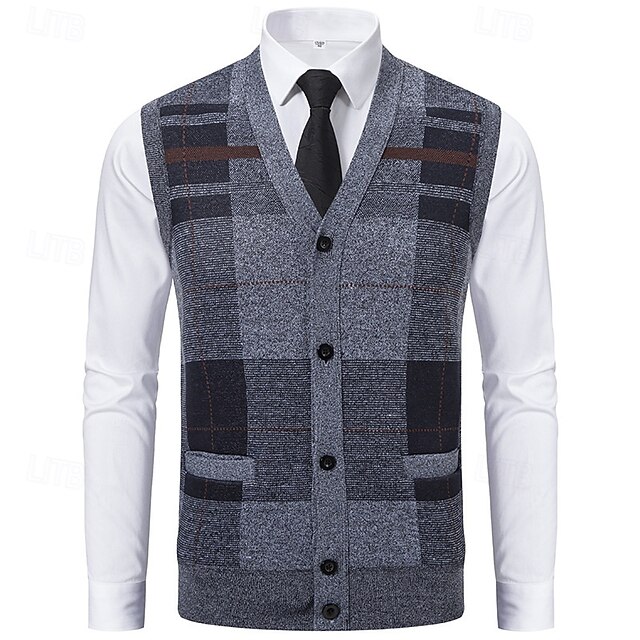 HOT ! Men's Sweater Sweater Vest Dress Sweater Cardigan Sweater Knit Sweater Ribbed Knit Regular Tops Knitted Ribbed Plaid V Neck Fashion Shawls Business Casual Clothing Apparel Fall Winter Navy Blue Light