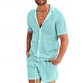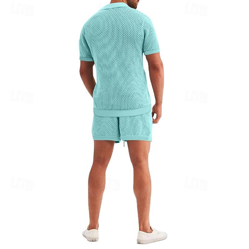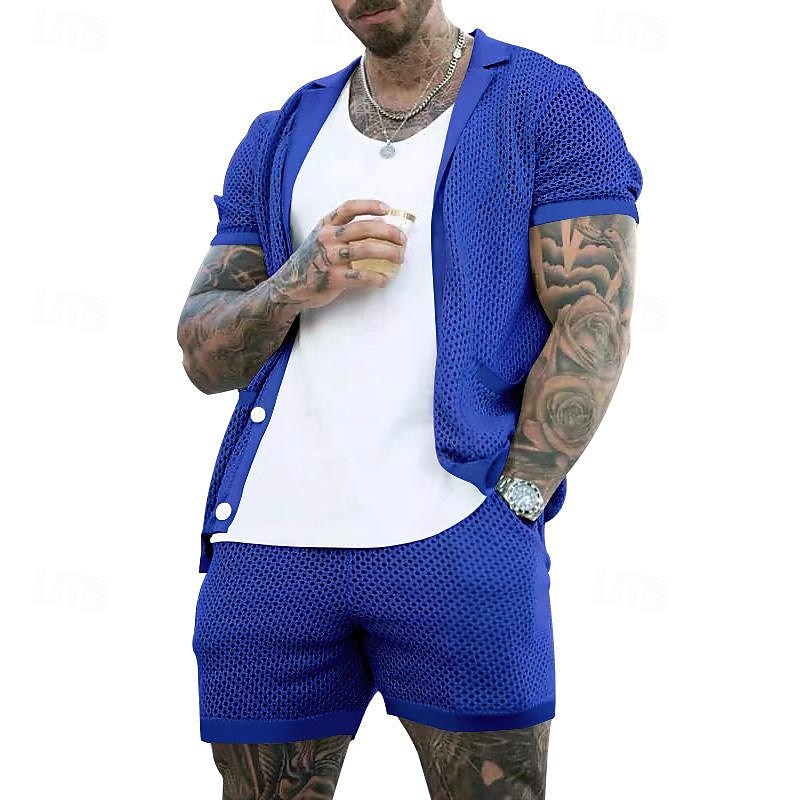 More information about Men's Shirt Shirt Set Summer Shirt Casual Shirt Beach Shirt Button Up Shirt Black White Royal Blue Light Grey Light Blue Short Sleeve Plain Lapel Vacation Hawaiian Mesh Clothing Apparel Polyester