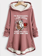 Highlights [Fabric]: Crafted from a blend of polyester, fleece, and sherpa with a cozy fleece lining, this hoodie sweatshirt offers warmth and comfort, perfect for the fall and winter seasons. The fabric ensures both softness and insulation, making it suitable for cooler weather. [Fit]: The hoodie features a regular fit with a long length, providing a comfortable and relaxed feel. The micro-elasticity of the material allows for easy movement and flexibility. [Design Highlights]: The hoodie is designed with an amusing and playful print of an owl wearing a sleep cap and holding a coffee mug, accompanied by the phrase "I'm multitasking, I can listen, ignore, and forget at the same time." This adds a quirky and entertaining element to the piece. Additionally, it includes a practical hood and decorative buttons along the sides to enhance its casual style. [Occasions]: Ideal for street and casual settings, this hoodie offers versatility for lounging at home or pairing with leggings for an effortlessly chic and laid-back look. [Size Range]: Available in a wide range of sizes, from S to 5XL, ensuring a suitable fit for various body types.
