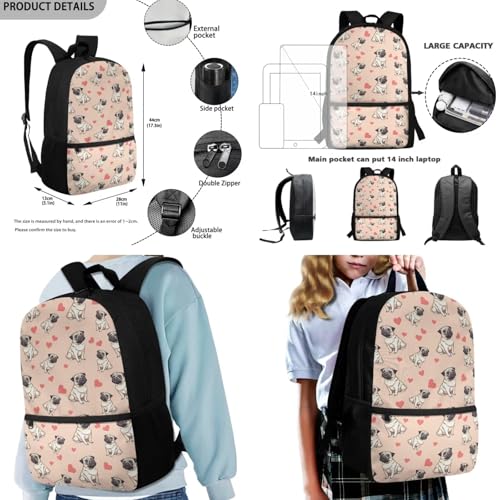 Coldinair Pug Girls Book Bag and Lunch Box Set Pink School Bags Set Cute Backpack for Girls Kids Elementary School Bookbag for Teens Kids Middle School Bookbag Travel Daypack Rucksack 7