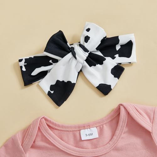 Kayotuas Western Baby Girl Clothes Summer Cowgirl Outfit Short Sleeve Romper Bow Boots Cow Print Flared Bell Bottom Pants Set 3