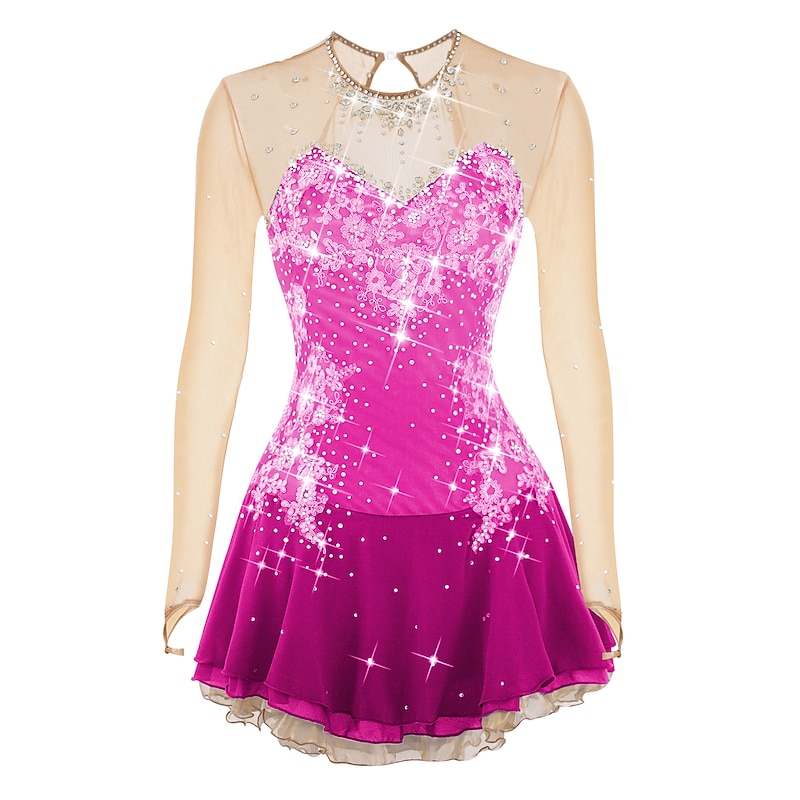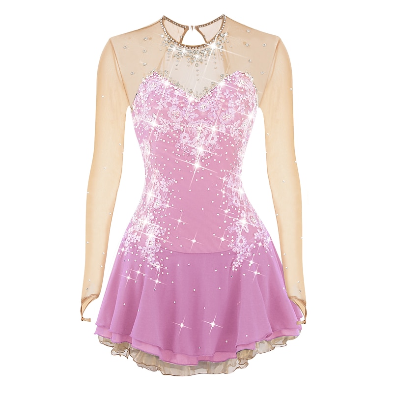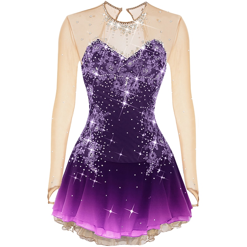Figure Skating Dress Women's Girls' Ice Skating Dress Outfits Violet White Dusty Rose Flower Open Back Mesh Spandex Competition Skating Wear Handmade Jeweled Rhinestone Long Sleeve Ice Skating Figure 23